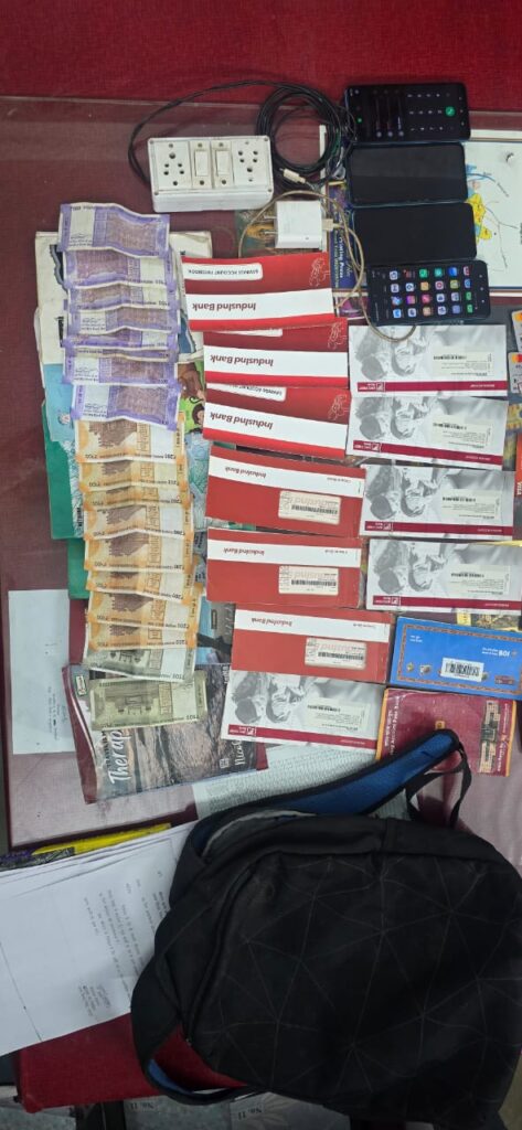 जिस पर आरोपी हर्ष पंजवानी को गिरफ्तार कर उसके *कब्जे से सट्टा संचालन में प्रयुक्त 04 नग मोबाईल फोन तथा नगदी रकम जुमला कीमती लगभग 60,000/- रूपये तथा विभिन्न कम्पनी के चेकबुक, पासबुक एवं ए.टी.एम. कार्ड एवं सट्टा के पैसों का हिसाब- किताब जप्त* कर आरोपी के विरूद्ध थाना तिल्दा नेवरा में अपराध क्रमांक 125/25 धारा 4(क) जुआ एक्ट एवं छ0ग0 जुआ प्रतिषेध अधिनियम 2022 की धारा 7 का अपराध पंजीबद्ध कर आरोपी के विरूद्ध कार्यवाही किया गया।