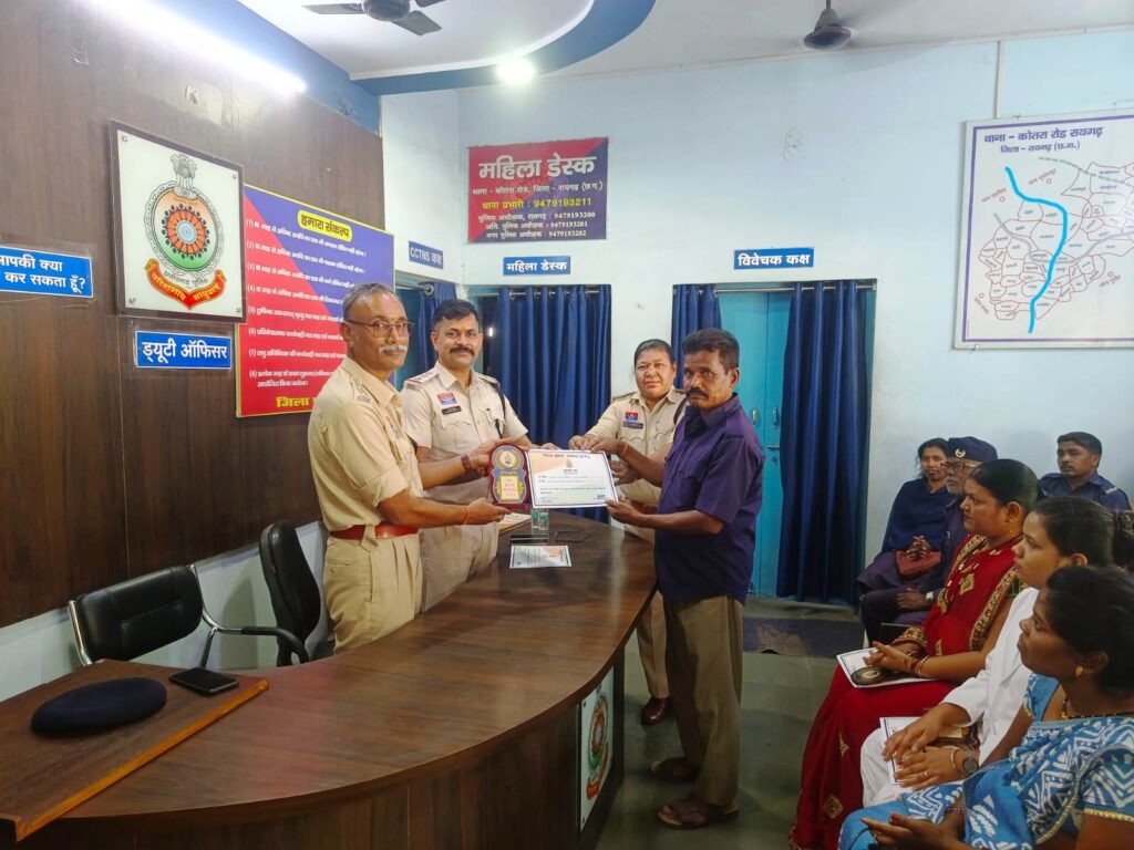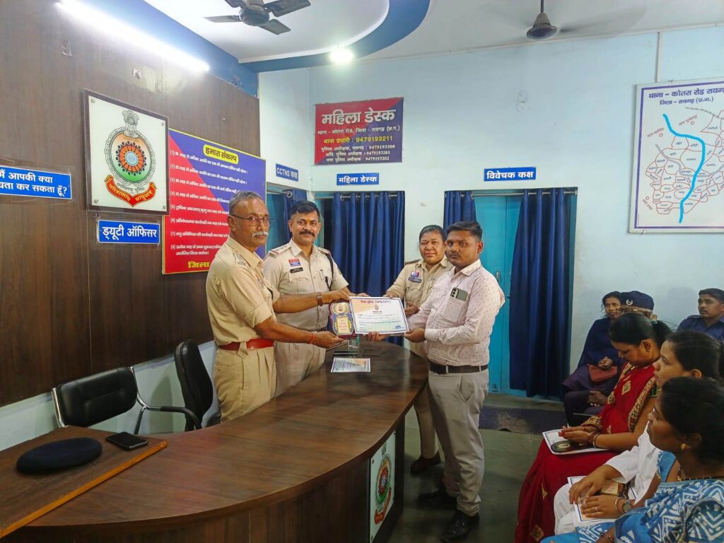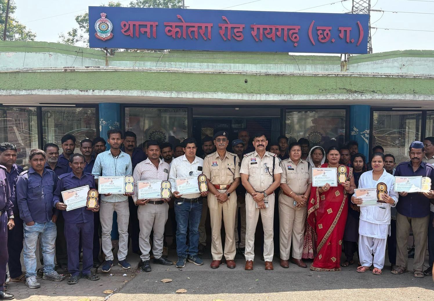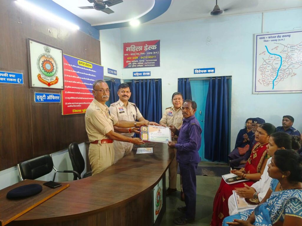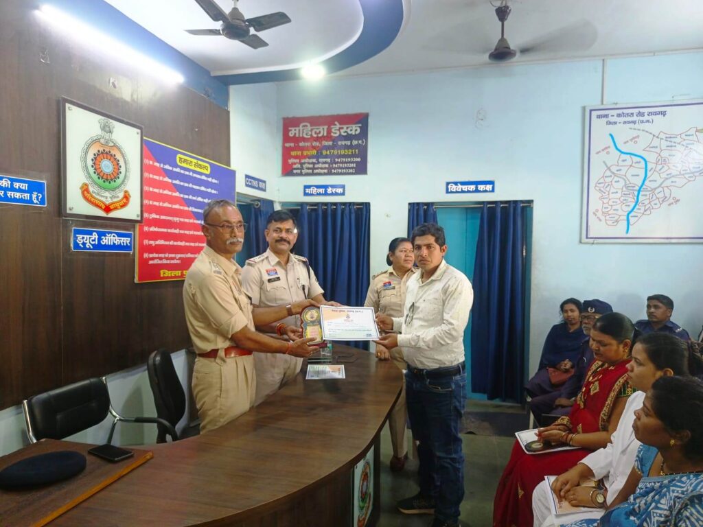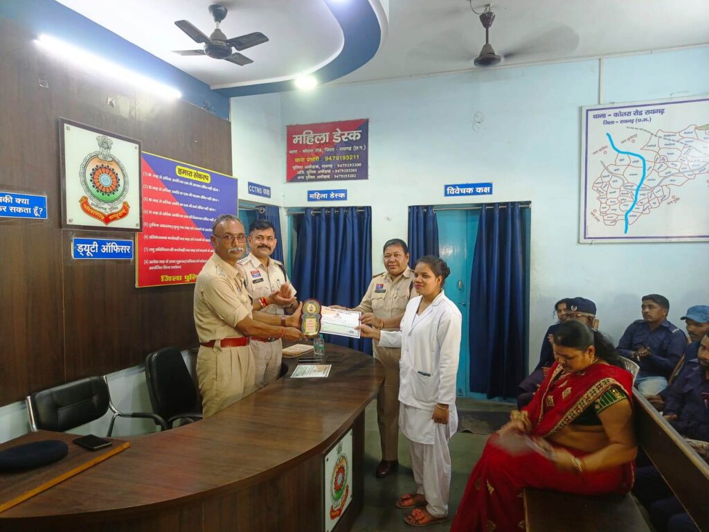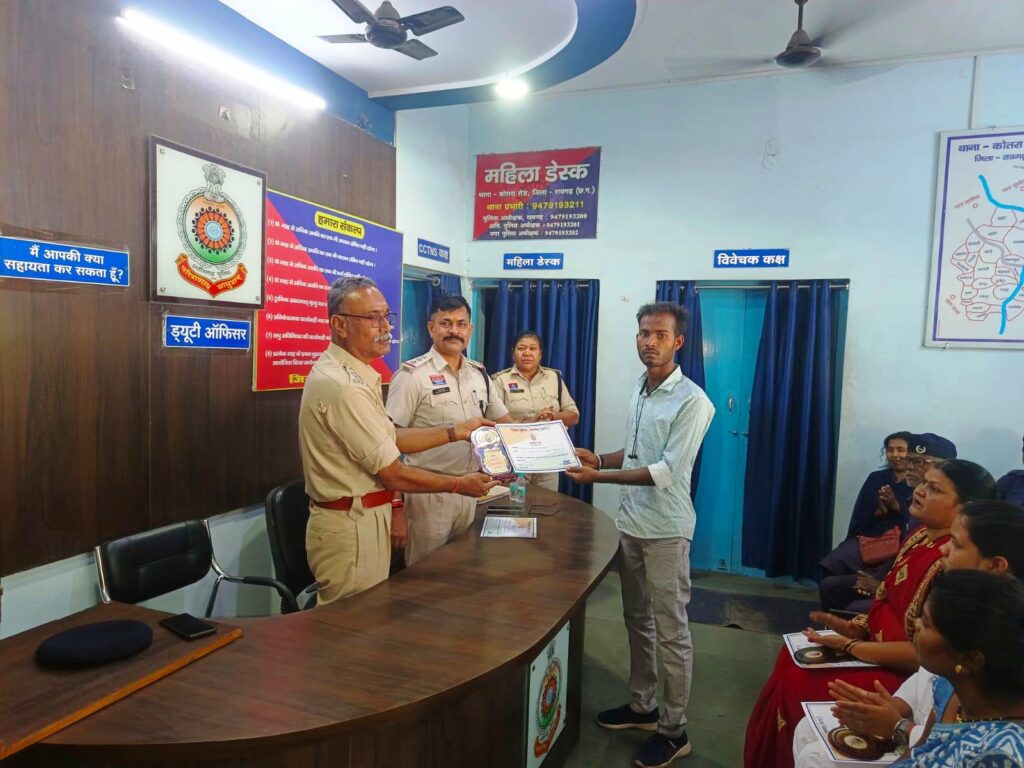 रायगढ़* । जिले में पुलिस अधीक्षक दिव्यांग कुमार पटेल के मार्गदर्शन में जनसेवा में उत्कृष्ट योगदान देने वालों को सम्मानित करने की पहल लगातार जारी है। इसी कड़ी में कोतरारोड़ थाना, पूंजीपथरा थाना एवं खरसिया चौकी में आज एक गरिमामय कार्यक्रम का आयोजन कर स्वास्थ्य कर्मियों, ग्राम कोटवारों, पुलिस मित्रों और सड़क दुर्घटना में तत्परता दिखाने वाले नागरिकों को प्रशस्ति पत्र प्रदान कर सम्मानित किया गया।