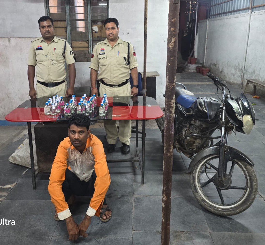 थाना प्रभारी जूटमिल निरीक्षक प्रशांत राव को सूचना मिली थी कि बस स्टैंड मटन मार्केट की ओर से एक व्यक्ति भारी मात्रा में शराब लेकर बिक्री हेतु जा रहा है। सूचना मिलते ही उन्होंने प्रधान आरक्षक शिव वर्मा को टीम के साथ कार्रवाई के निर्देश दिए। तत्परता दिखाते हुए पुलिस टीम ने दुर्गा चौक मिट्ठुमुड़ा पर घेराबंदी की और एक संदिग्ध व्यक्ति को रोककर जांच की। *आरोपी खगेश्वर साव पिता घुरवा साव उम्र 32 वर्ष निवासी गढ़उमरिया थाना जुटमिल* के पास से 30 पाव देशी प्लेन शराब, कुल 5 लीटर 400 मिलीलीटर बरामद की गई। साथ ही शराब ढोने में इस्तेमाल की जा रही काले रंग की TVS डिस्कवर मोटरसाइकिल (CG 13 UA 0754) भी जब्त की गई है।
