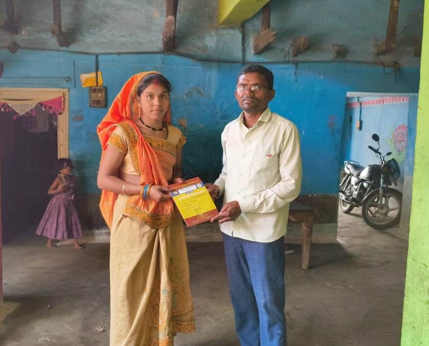 घर पहुंचाकर कृषक देवेंद्र सिदार को दी गयी किसान किताब की प्रति