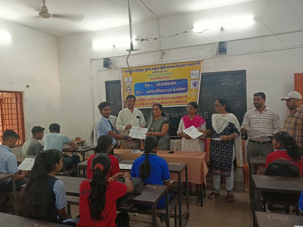 रायगढ़, / शासकीय हेमसुंदर गुप्त उत्कृष्ट हिंदी माध्यम विद्यालय में आज प्राचार्य जे. सुजाता राव के मार्गदर्शन में व्यावसायिक शिक्षा के अंतर्गत कार्यक्रम का आयोजन किया गया। जिसमें व्यावसायिक शिक्षा के तहत आसपास के विभिन्न संस्थाओं में इंटर्नशिप पूर्ण करने पर विद्यार्थियों को सर्टिफिकेट का वितरण किया गया और उन्हें करियर से संबंधित जानकारी प्रदान की गई।