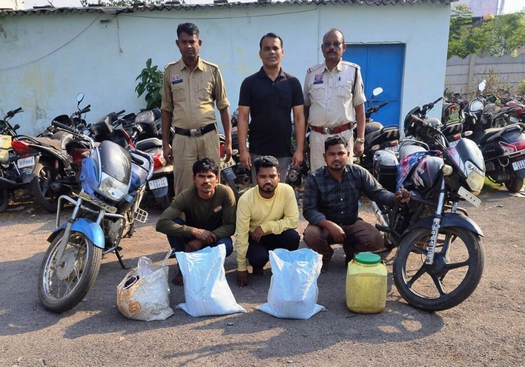 रायगढ़* । पुलिस अधीक्षक दिव्यांग पटेल के निर्देशन पर चलाए जा रहे अवैध शराब के खिलाफ अभियान के तहत मंगलवार को कोतरारोड़ पुलिस ने डीएसपी सुशांतो बनर्जी के मार्गदर्शन और थाना प्रभारी त्रिनाथ त्रिपाठी के नेतृत्व में नवापारा क्षेत्र में दो अलग-अलग स्थानों पर छापामार कार्रवाई कर करीब 50 लीटर कच्ची महुआ शराब जब्त की। दोनों कार्रवाइयों में तीन आरोपियों को गिरफ्तार कर उनके कब्जे से दो मोटरसाइकिल समेत कुल 51,500 रुपये मूल्य का सामान बरामद किया गया।