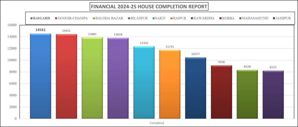 रायगढ़/ प्रधानमंत्री आवास योजना (ग्रामीण) के तहत रायगढ़ जिले ने एक उल्लेखनीय उपलब्धि हासिल की है। पूरे प्रदेश में आवास निर्माण के मामले में पहले पायदान पर है। रायगढ़ जिला प्रशासन द्वारा इसके लिए समन्वित रणनीति बनाकर मिशन मोड में काम किया गया, जिसका असर रहा कि आवास निर्माण के मामले में रायगढ़ पूरे प्रदेश में टॉप पर रहा। जिले को वित्तीय वर्ष 2024-25 के अंतर्गत 60 हजार 609 आवासों का लक्ष्य प्राप्त हुआ। इनमें से 52 हजार 307 आवासों को स्वीकृति प्रदान कर दी गई है। जिसमें से अब तक 14 हजार 541 आवासों का निर्माण पूर्ण किया जा चुका है। यह इस अवधि में पूरे राज्य में सर्वाधिक है।