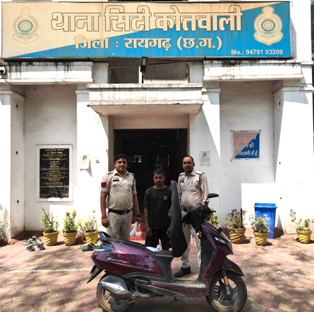 रायगढ़ । कोतवाली पुलिस ने अवैध शराब तस्करी पर एक बार फिर सख्त कार्रवाई करते हुए 09 मई 2025 को रामभांठा मैदान में एक युवक को स्कूटी में महुआ शराब ले जाते रंगे हाथ पकड़ा। आरोपी युवक जुपीटर स्कूटी में शराब लेकर रामभांठा की ओर से कोतरारोड जा रहा था, जिसकी सूचना पुलिस को पहले ही मिल गई थी। सूचना के आधार पर थाना प्रभारी के निर्देश पर प्रधान आरक्षक लोमस राजपूत और आरक्षक संजय चौहान ने रामभांठा मैदान में घेराबंदी कर संदिग्ध युवक को स्कूटी क्रमांक CG 13 BD 8923 सहित रोका।