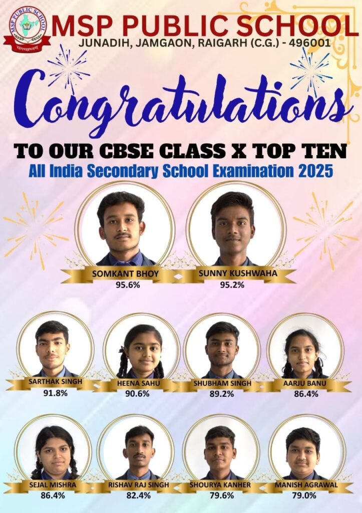 जुनाडीह, जामगाँव, 2025 सेंट्रल बोर्ड ऑफ सेकेंडरी एजुकेशन (सीबीएसई) ने कक्षा 10वीं के परिणाम घोषित कर दिए हैं। एम एस पी पब्लिक स्कूल के विद्यार्थियों द्वारा विभिन्न विषयों में उत्कृष्ट प्रदर्शन किया गया। सोमकांत भोय ने 95.6 % , सन्नी कुशवाहा ने 95.2 %, सार्थक सिंह ने 91.8%, हीना साहू ने 90.6% अंक हासिल किए हैं। सोमकांत भोय द्वारा सामाजिक विज्ञान विषय में 100 में से 100 अंक हासिल किया गया। बोर्ड परीक्षा में अन्य विद्यार्थियों का प्रदर्शन भी प्रशंसनीय रहा। परीक्षाफल आशा के अनुरूप रहा।