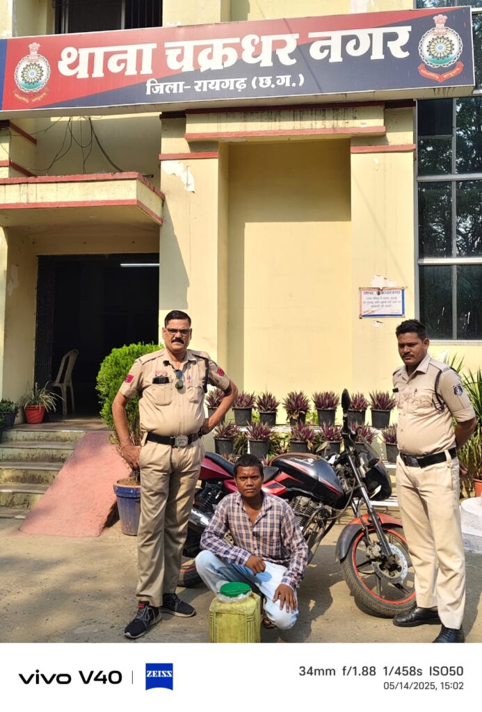 रायगढ़ – रायगढ़ जिले के चक्रधरनगर थाना क्षेत्र में बीती रात पुलिस ने तस्करी के खिलाफ बड़ी कार्रवाई करते हुए एक युवक को 15 लीटर महुआ शराब के साथ रंगे हाथ पकड़ा है। थाना प्रभारी निरीक्षक अमित शुक्ला के नेतृत्व में की गई इस कार्रवाई में आरोपी अनिल उरांव, पिता स्व. नत्थुलाल उरांव, उम्र 24 वर्ष, निवासी मधुबनपारा दुर्गा मंदिर के पास, थाना सिटी कोतवाली को गोवर्धनपुर पुलिया के पास घेराबंदी कर पकड़ा गया। आरोपी अपने पल्सर मोटरसाइकिल में महुआ शराब लेकर परिवहन करते हुए पकड़ा गया है।