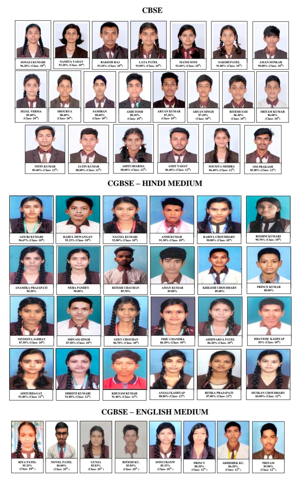 12वीं सी.बी.एस.ई. में नितिन श्रीवास नें 89.5%, 10वीं में सोनाली कु. 96.20% , सी. जी. बोर्ड – अंग्रेजी माध्यम 12वीं में प्रिन्सी श्रीवास्तव 88.20%, 10वीं में रिया पटेल 95.33%, सी.जी. बोर्ड – हिन्दी माध्यम 12वीं में अदिती भगत नें 93.40% , 10वीं में गौरी कुमारी 96.70% अंक प्राप्त कर उच्चतम स्थान प्राप्त किये।