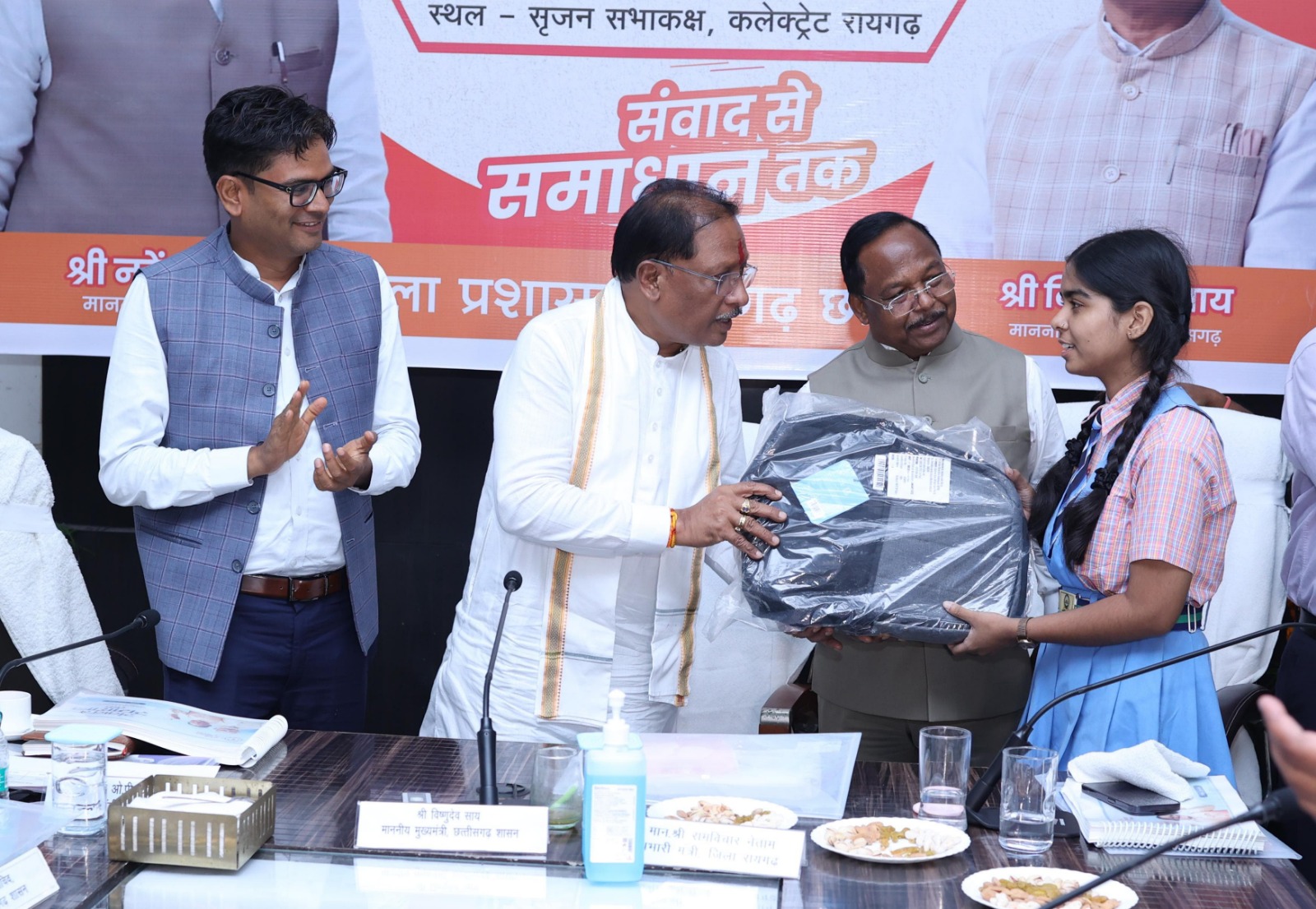 रायगढ़, / मुख्यमंत्री श्री विष्णुदेव साय आज सुशासन तिहार में रायगढ़ प्रवास के दौरान रायगढ़ से कक्षा 10 वीं और 12 वीं के मेरिट लिस्ट में स्थान बनाने वाले पांचों छात्रों से मुलाकात की। उन्होंने छात्रों की इस सफलता पर बधाई देते हुए सभी को लैपटाप प्रदान किया। इस अवसर पर कृषि मंत्री एवं जिले के प्रभारी मंत्री श्री रामविचार नेताम, वित्त मंत्री श्री ओ.पी.चौधरी, लोकसभा सांसद श्री राधेश्याम राठिया, राज्यसभा सांसद श्री देवेन्द्र प्रताप सिंह, महापौर श्री जीवर्धन चौहान व सभापति श्री डिग्री लाल साहू उपस्थित रहे।