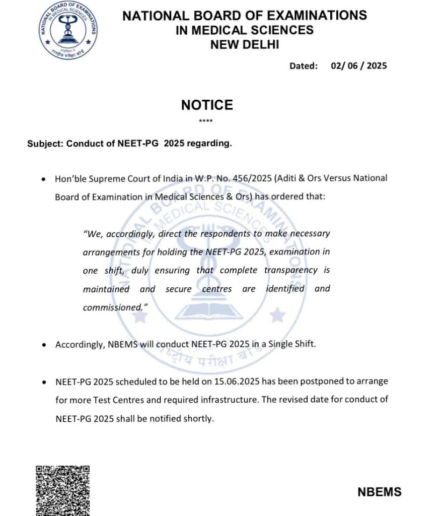 * । 2024 में NEET PG की परीक्षा दो पालियो में की गई थी जिससे विद्यार्थी काफी परेशान हुए थे। प्रथम पाली का पेपर काफी सरल था और दूसरी पाली का पेपर काफी टॉप था। इस वजह से ग्रेस मार्क्स सेकंड पाली वाले विद्यार्थियों को दिया गया था ।इस समस्या को खत्म करने हेतु सुप्रीम कोर्ट ने WP 456 /2025 (Aditi and ors verses National Board of Examination in Medical Sciences and Others) की सुनवाई करते हुए 2/6/ 2025 को आदेश पारित किया की NEET PG 2025 सिंगल पाली में होगी । जिसके कारण NEET PG 2025 परीक्षा को स्थगित करना पड़ा एवं नई समय सारणी शीघ्र ही जारी की जाएगी ।इससे विद्यार्थी एवं पलकों को काफी राहत मिली है जो बहुत दूर दराज इलाकों से आकर परीक्षा देने के लिए इंतजार करना पड़ रहा था।