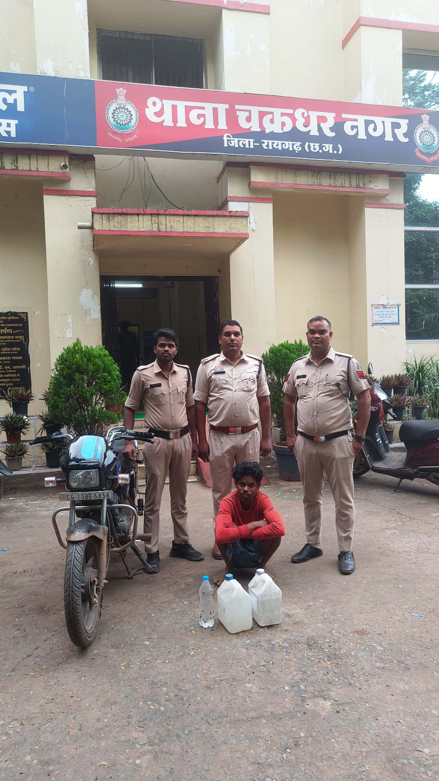 ● ** *रायगढ़, 29 जून 2025* — जिले में अवैध शराब पर रोक लगाने के क्रम में चक्रधरनगर पुलिस ने आज ग्राम नटवरपुर में दो अलग-अलग कार्रवाइयों को अंजाम देकर कुल 26 लीटर महुआ शराब जब्त करते हुए दो आरोपियों को गिरफ्तार किया है। पुलिस को नटवरपुर क्षेत्र में अवैध शराब बिक्री की सूचना मिलने पर त्वरित कार्रवाई की गई। पहली कार्रवाई में पुलिस टीम ने नटवरपुर जंगल के रास्ते में घेराबंदी कर एक व्यक्ति को पकड़ा। पूछताछ में उसने अपना नाम कमल धनवार (34 वर्ष) पिता हुलव धनवार निवासी नटवरपुर, थाना चक्रधरनगर बताया। उसके कब्जे से 10 लीटर और 5 लीटर वाले प्लास्टिक जरीकेन में कुल 15 लीटर महुआ शराब बरामद हुई, जिसकी कीमत लगभग 1500 रुपये है। इसी क्रम में दूसरी कार्रवाई में पुलिस ने ग्राम नटवरपुर पहुंच मार्ग पर मुखबिर सूचना पर एक मोटरसाइकिल सवार को रोका, जो अवैध शराब परिवहन कर रहा था। आरोपी ने अपना नाम फुलसिंह धनवार (35 वर्ष) पिता पुसाउ धनवार निवासी ग्राम नटवरपुर थाना चक्रधरनगर बताया। उसके पास दो 5-5 लीटर के प्लास्टिक जरीकेन एवं एक लीटर की प्लास्टिक बोतल में कुल 11 लीटर कच्ची महुआ शराब मिली। साथ ही शराब परिवहन में प्रयुक्त स्प्लेंडर प्लस मोटरसाइकिल क्रमांक CG 13 BE 5856 भी जब्त की गई है। दोनों मामलों में आरोपियों के खिलाफ थाना चक्रधरनगर में पृथक-पृथक अपराध क्रमांक 291/2025 व 292/2025 धारा 34(2), 59(क) आबकारी एक्ट के तहत अपराध दर्ज कर आवश्यक कार्रवाई की गई है। पुलिस अधीक्षक दिव्यांग पटेल के निर्देशन पर क्षेत्र में अवैध शराब के खिलाफ लगातार सख्त अभियान जारी है। अवैध शराब के खिलाफ हुई इस कार्रवाई में एएसआई नंद कुमार सारथी, आशिक रात्रे, प्रधान आरक्षक श्यामदेव साहू, रवि कुमार साय, आरक्षक मिनकेतन पटेल, रूपराम साहू, एलिशा टोप्पो और माधुरी राठिया सक्रिय रूप से शामिल रहे।