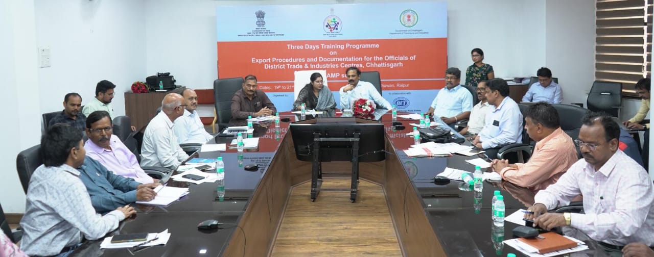 रायपुर / छत्तीसगढ़ में रैम्प (RAMP) योजना के तहत जिला व्यापार एवं उद्योग केंद्रों के अधिकारियों के लिए ‘निर्यात प्रक्रियाएँ और प्रलेखन‘ विषय पर तीन दिवसीय क्षमता विकास प्रशिक्षण कार्यक्रम का सफल आयोजन किया गया। यह प्रशिक्षण 19 से 21 जुलाई 2025 तक रायपुर स्थित उद्योग भवन में संपन्न हुआ, जिसे एक्सपोर्ट फैसिलिटेशन सेंटर और भारतीय विदेश व्यापार संस्थान कोलकाता के सहयोग से आयोजित किया गया। यह प्रशिक्षण कार्यक्रम अधिकारियों को अपने जिलों में निर्यात को बढ़ावा देने और स्थानीय उत्पादों को वैश्विक बाजारों तक पहुंचाने की दिशा में दक्ष और समर्थ बनाने में महत्वपूर्ण सिद्ध हुआ है।