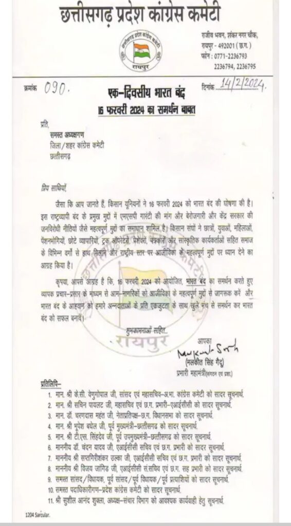 संयुक्त किसान मोर्चा ने आज (16 फरवरी) भारत बंद का आयोजन किया है, और इस मुहिम में कांग्रेस ने भी अपना समर्थन जताया है। इसके परिणामस्वरूप, छत्तीसगढ़ कांग्रेस ने लोगों से अपने प्रतिष्ठान को बंद रखने के लिए उनके साथी होने की अपील की है।