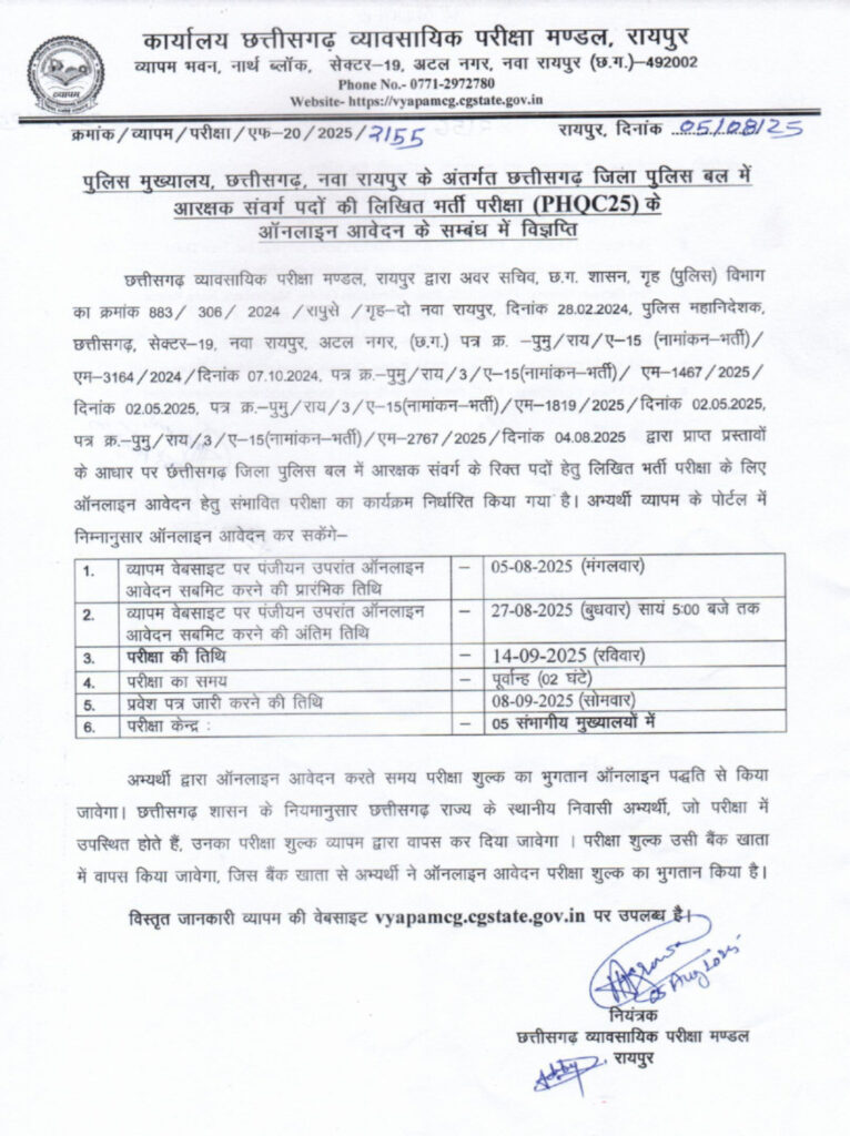 पुलिस मुख्यालय, छत्तीसगढ़, नवा रायपुर के अंतर्गत छत्तीसगढ़ जिला पुलिस बल में आरक्षक संवर्ग पदों की लिखित भर्ती परीक्षा (PHQC25) के ऑनलाइन आवेदन के सम्बंध में विज्ञप्ति