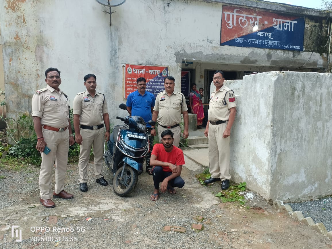 *रायगढ़, कापू पुलिस ने आज बड़ी कार्रवाई करते हुए कदमचौक से एक स्थायी वारंटी आरोपी को चोरी की स्कूटी बेचने की फिराक में दबोच लिया। थाना प्रभारी कापू उप निरीक्षक इगेश्वर यादव को मुखबिर से सूचना मिली थी कि एक व्यक्ति चोरी की जुपिटर स्कूटी बेचने ग्राहक तलाश रहा है। सूचना पर तत्काल कार्रवाई करते पुलिस ने मौके से संदेही को पकड़ा जिसके पास से स्कूटी क्रमांक सीजी 13 बीई 9161 बरामद की गई। पूछताछ में आरोपी ने खुलासा किया कि उसने 27 अगस्त की रात वन विभाग परिसर, शराब भट्टी के सामने मेन रोड से स्कूटी चोरी की थी। इस संबंध में थाना कापू में अपराध क्रमांक 144/2025 धारा 303(2) बीएनएस पंजीबद्ध है।