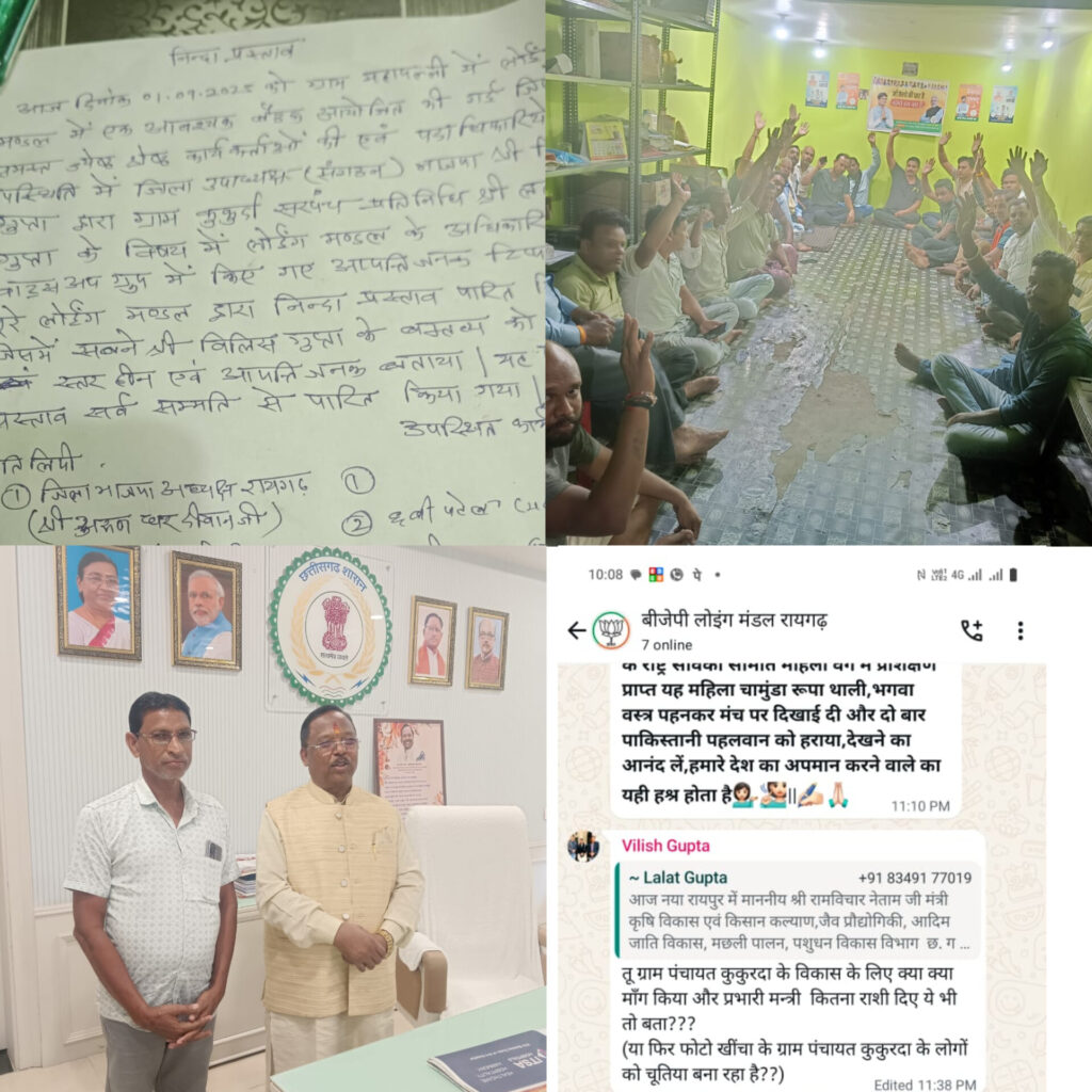 रायगढ़ । जिला भाजपा के वरिष्ठ कार्यकर्ता और ग्राम कुकुर्दा के सरपंच प्रतिनिधि ललाट गुप्ता ने जिला के प्रभारी मंत्री और राज्य शासन के कैबिनेट मंत्री रामविचार नेताम से राजधानी रायपुर में उनके निवास स्थान पर सौजन्य मुलाकात की और ग्राम कुकुर्दा तथा रायगढ़ पूर्वांचल के विकास संबंधी विभिन्न मुद्दों पर विस्तृत चर्चा की । मालूम हो कि मंत्री रामविचार नेताम कृषि विकास एवं किसान कल्याण , जैव प्रौद्योगिकी, आदिम जाति विकास, मछली पालन तथा पशुधन विकास जैसे महत्वपूर्ण विभागों का उत्तरदायित्व संभालते हैं । सरपंच प्रतिनिधि ललाट गुप्ता ने महत्वपूर्ण मुद्दों पर मंत्री जी से सार्थक चर्चा की । मंत्री जी द्वारा अपना महत्वपूर्ण समय देने और सार्थक चर्चा करने के लिए ललाट गुप्ता ने उनका आभार प्रकट किया । परन्तु बताया जा रहा है कि इस सार्थक मुलाकात को लेकर रायगढ़ जिला उपाध्यक्ष विलिस गुप्ता द्वारा भाजपा लोइंग मंडल के आधिकारिक वाट्सअप ग्रुप में अभद्र टिप्पणी की गई जिसे लेकर स्थानीय भाजपा कार्यकर्ताओं और पार्टी पदाधिकारियों में रोष व्याप्त है । इस संबंध में भाजपा लोइंग मंडल द्वारा निंदा प्रस्ताव पारित किया गया । बैठक में सर्वसम्मति से विलिस गुप्ता द्वारा की गई टिप्पणी को अभद्र, स्तरहीन और आपत्तिजनक करार दिया गया । प्रस्ताव की प्रतिलिपि रायगढ़ जिला भाजपा अध्यक्ष , जिला भाजपा अनुशासन समिति , रायगढ़ विधायक वित्त मंत्री ओ पी चौधरी और रायगढ़ जिला प्रभारी मंत्री रामविचार नेताम को प्रेषित की गई है ।