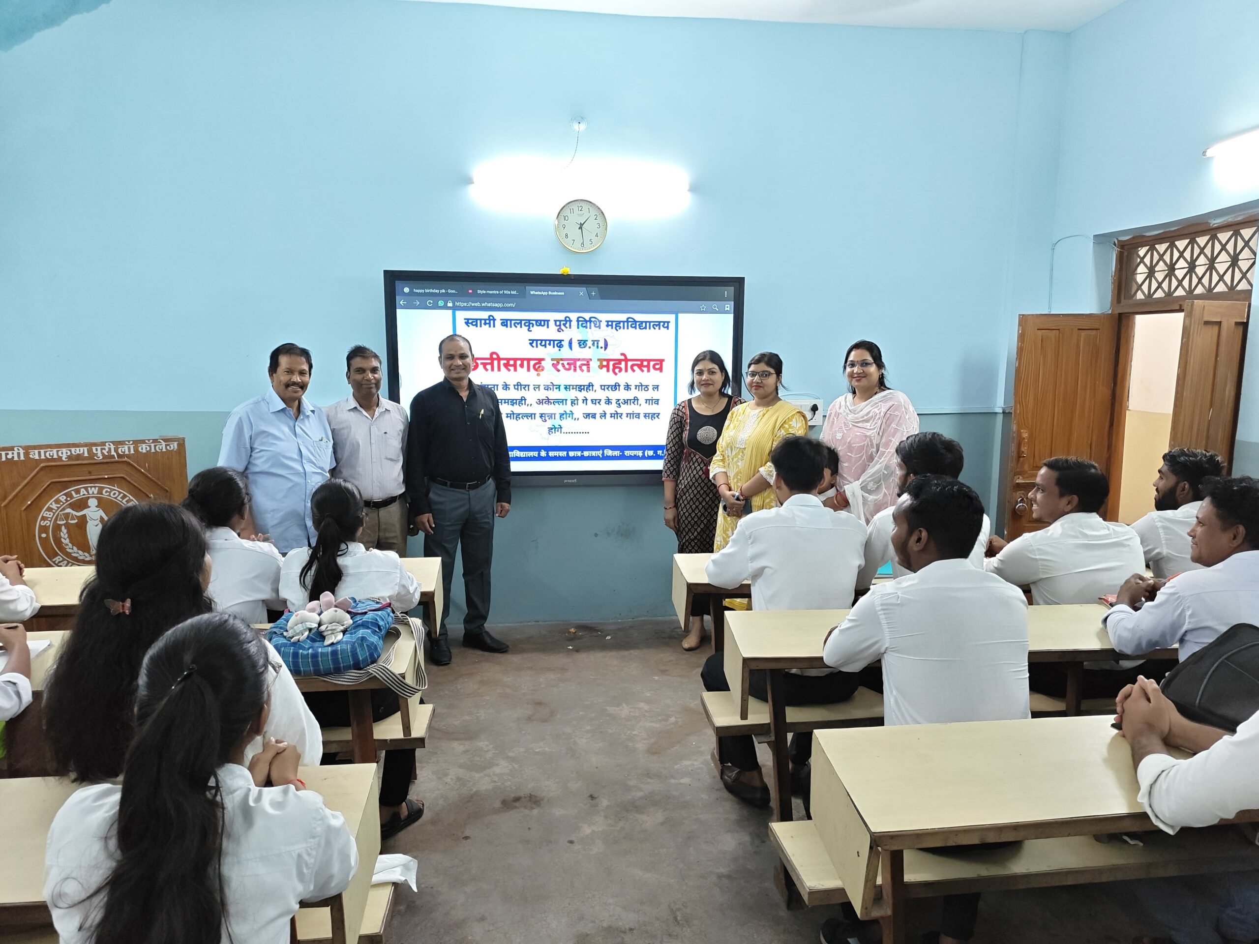 रायगढ़ । स्वामी बालकृष्ण विधि महाविद्यालय रायगढ़ में छ.ग. शासन के निर्देशों का पालन करते हुए छत्तीसगढ़ राज्य को 25 वर्ष पूर्ण होने पर छत्तीसगढ़ रजत जयंती मनाया गया जिसमें छात्र-छात्राओं द्वारा छ. ग. लोक पारंपरिक गीतों एवं नृत्य का आयोजन महाविद्यालय में किया गया, एवं छत्तीसगढ़ के कला संस्कृति, रीति रिवाजों, परंपराओं एवं वर्तमान में छ.ग. हुए विकास के संबंध में भी प्राचार्य द्वारा जानकारी छात्र-छात्राओं को दिया गया ।