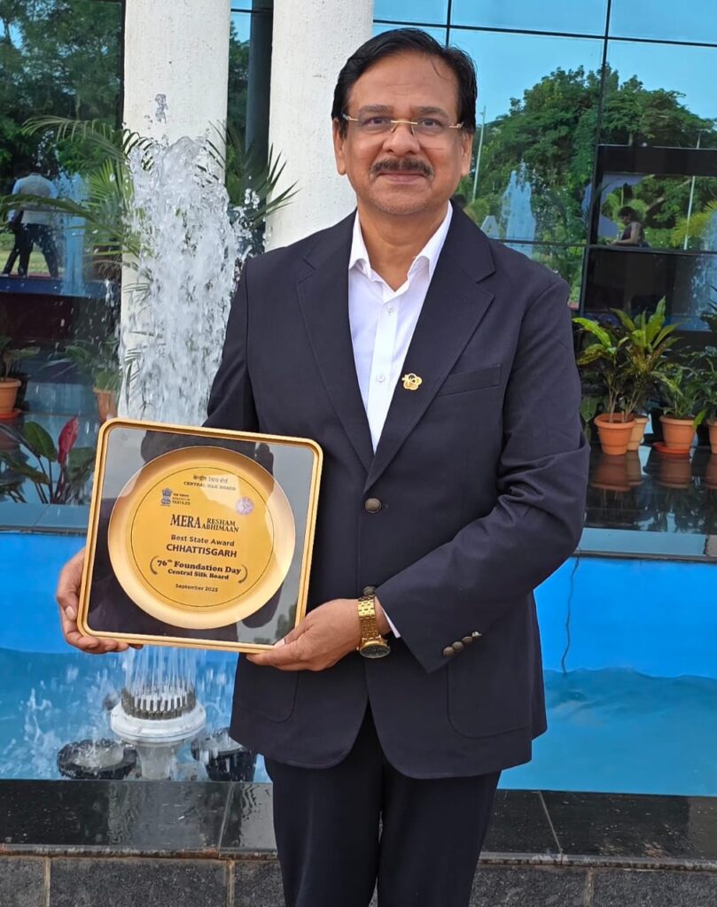 रायपुर / छत्तीसगढ़ को रेशम उत्पादन के क्षेत्र में उत्कृष्ट कार्य के लिए भारत सरकार के केन्द्रीय रेशम बोर्ड द्वारा राष्ट्रीय पुरस्कार ‘बेस्ट सेरीकल्चर स्टेट‘ से सम्मानित किया गया है। यह पुरस्कार बोर्ड के 76वें स्थापना दिवस 20 सितंबर 2025 को बेंगलूर में आयोजित कार्यक्रम में सांसद एवं बोर्ड सदस्य श्री के. सुधाकर के हाथों प्रदान किया गया। यह पुरस्कार उप संचालक रेशम श्री मनीष पवार ने ग्रहण किया।