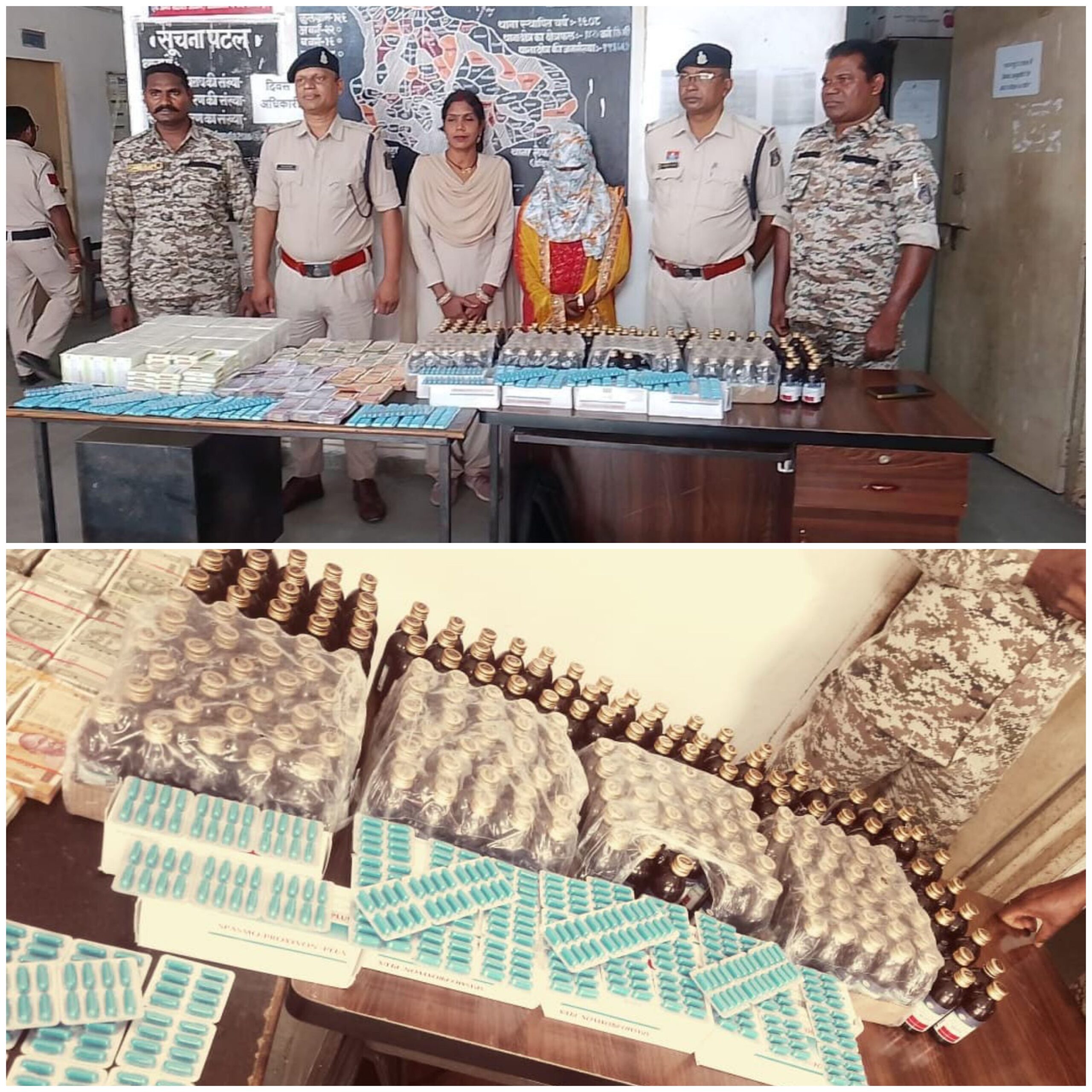 इसी कड़ी में बीती रात मुखबिर की सूचना पर थाना प्रभारी रोहित बंजारे के नेतृत्व में टीम ने दुर्गापुर लारीपानी निवासी *धनुर्जय यादव* के मकान की घेराबंदी की। छापेमारी में धनुर्जय यादव घर पर नहीं मिला, लेकिन उसकी पत्नी *तिलोत्तमा यादव (उम्र 25 वर्ष)* घर में मौजूद मिली। तलाशी में उसके घर पर मिले नशीली दावों के जखीरा को लेकर पूछताछ करने पर महिला ने स्वीकार किया कि वह अपने पति के साथ मिलकर नशीली दवाओं की बिक्री करती है। गवाहों की मौजूदगी में घर की तलाशी लेने पर पुलिस ने भारी मात्रा में नशीली दवाएं और नशीली दावों की अवैध बिक्री से अर्जित नगदी जब्त की।