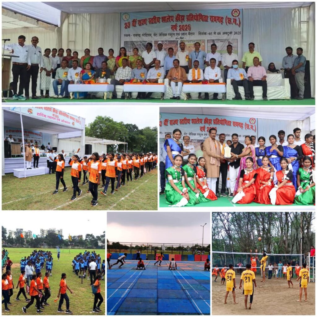 25वीं राज्य स्तरीय शालेय क्रीड़ा प्रतियोगिता का भव्य आयोजन रायगढ़ स्टेडियम में 5 से 8 अक्टूबर तक किया जा रहा है। जिसमें रायपुर, बिलासपुर, दुर्ग, बस्तर एवं सरगुजा संभाग के खिलाड़ी भाग ले रहे हैं। इस प्रतियोगिता में वालीबॉल, सॉफ्ट बॉल, खो-खो एवं क्रिकेट के खिलाड़ी भाग ले रहे हैं। जिसमें पहले दिन सॉफ्ट बॉल बालक 19 वर्ष के लिग मैच अंतर्गत बस्तर बनाम रायपुर में रायपुर विजेता रहा। वहीं दुर्ग बनाम सरगुजा में दुर्ग विजेता रहा। बिलासपुर बनाम बस्तर में मैच ड्राॅ, रायपुर विरूद्ध सरगुजा में रायपुर, दुर्ग बनाम बस्तर में दुर्ग विजेता रहा। बिलासपुर बनाम सरगुजा में बिलासपुर विजेता रहा। सरगुजा बनाम बस्तर में बस्तर विजेता रहा। बिलासपुर बनाम रायपुर में रायपुर की टीम विजेता रही। सॉफ्ट बॉल बालिका 14 वर्ष के लिग मैच अंतर्गत बिलासपुर बनाम सरगुजा में बिलासपुर की टीम विजेता रही। क्रिकेट बालिका 19 वर्ष के लिग मैच अंतर्गत रायपुर बनाम दुर्ग में रायपुर 117 रन से विजेता रही। वहीं सरगुजा बनाम बस्तर में सरगुजा संभाग 82 रन से विजेता रही और रायपुर बनाम बिलासपुर में रायपुर 29 रन से जीत दर्ज कर नाम किया। खो-खो बालक 17 वर्ष के लिग मैच अंतर्गत सरगुजा बनाम बिलासपुर में बिलासपुर विजेता रहा। वाॅली बाॅल बालक 14 वर्ष के लिग मैच अंतर्गत बिलासपुर बनाम सरगुजा में बिलासपुर ने 2-1 से और बस्तर बनाम दुर्ग में बस्तर ने 2-0 से जीत अपने नाम किया। वहीं वाॅली बॉल बालिका 14 वर्ष के लिग मैच में बिलासपुर बनाम रायपुर में बिलासपुर ने 2-0 से और दुर्ग बनाम सरगुजा में दुर्ग ने 2-0 से जीत अपने नाम किया।