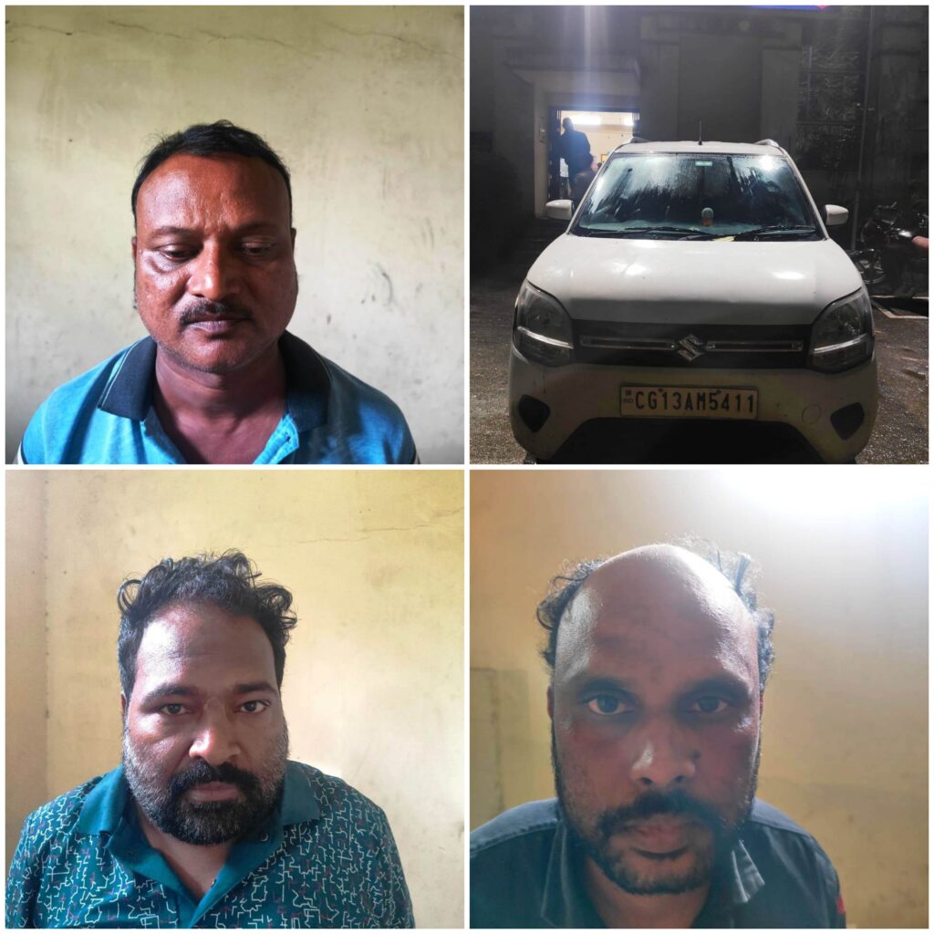 *रायगढ़। पुलिस अधीक्षक श्री दिव्यांग कुमार पटेल के दिशा-निर्देशन पर जिले में मादक पदार्थों की तस्करी पर सख्त निगरानी रखी जा रही है। इसी कड़ी में आज चक्रधरनगर पुलिस और साइबर सेल की संयुक्त कार्रवाई में तीन गांजा तस्करों को वैगनआर कार सहित गिरफ्तार किया गया है। आरोपियों के पास से नकदी रकम 2000 रूपये तथा 1.152 किलोग्राम गांजा, बरामद किया गया है, जिसकी कीमत लगभग 5,500 रुपये है। तीनों आरोपियों पर एनडीपीएस एक्ट की धाराओं के तहत गिरफ्तार कर रिमांड पर भेजा गया है।