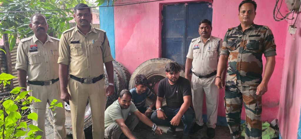 *रायगढ़, । पुलिस अधीक्षक श्री दिव्यांग पटेल के दिशा-निर्देशन और नगर पुलिस अधीक्षक श्री मयंक मिश्रा के मार्गदर्शन पर जूटमिल पुलिस ने ट्रेलर से टायर चोरी के मामले में बड़ी सफलता हासिल की है। पुलिस ने चोरी किए गए टायर खरीदने वाले चार आरोपियों को गिरफ्तार कर रिमांड पर जेल भेज दिया है।