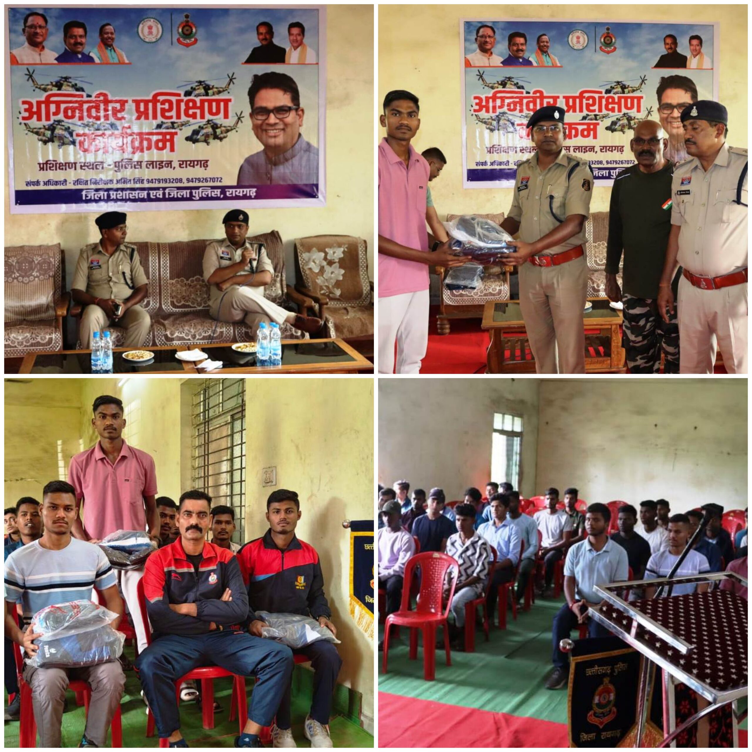*रायगढ़, । शासन की महत्वाकांक्षी “अग्निवीर” योजना के तहत लिखित परीक्षा में सफल अभ्यर्थियों के लिए जिले में माननीय वित्त मंत्री ओपी चौधरी सर के मार्गदर्शन पर जिला प्रशासन एवं जिला पुलिस द्वारा विशेष प्रशिक्षण शिविर का आयोजन उर्दना पुलिस लाइन में किया जा रहा है। आज दिनांक 28.10.2025 को पुलिस अधीक्षक श्री दिव्यांग पटेल ने शिविर का विधिवत शुभारंभ किया। इस अवसर पर उन्होंने रायगढ़ सहित जिले के विभिन्न तहसीलों से आए अभ्यर्थियों से परिचय प्राप्त किया और उन्हें प्रोत्साहित किया। उन्होंने बताया कि पिछले साल 50 से अधिक अभ्यर्थियों ने शिविर में भाग लिया था जिसमें 15 अभ्यर्थियों का सलेक्शन हुआ, इस बार और अधिक अभ्यर्थियों का सलेक्शन हो इसके लिए अपनी शुभकामनाएं दी ।