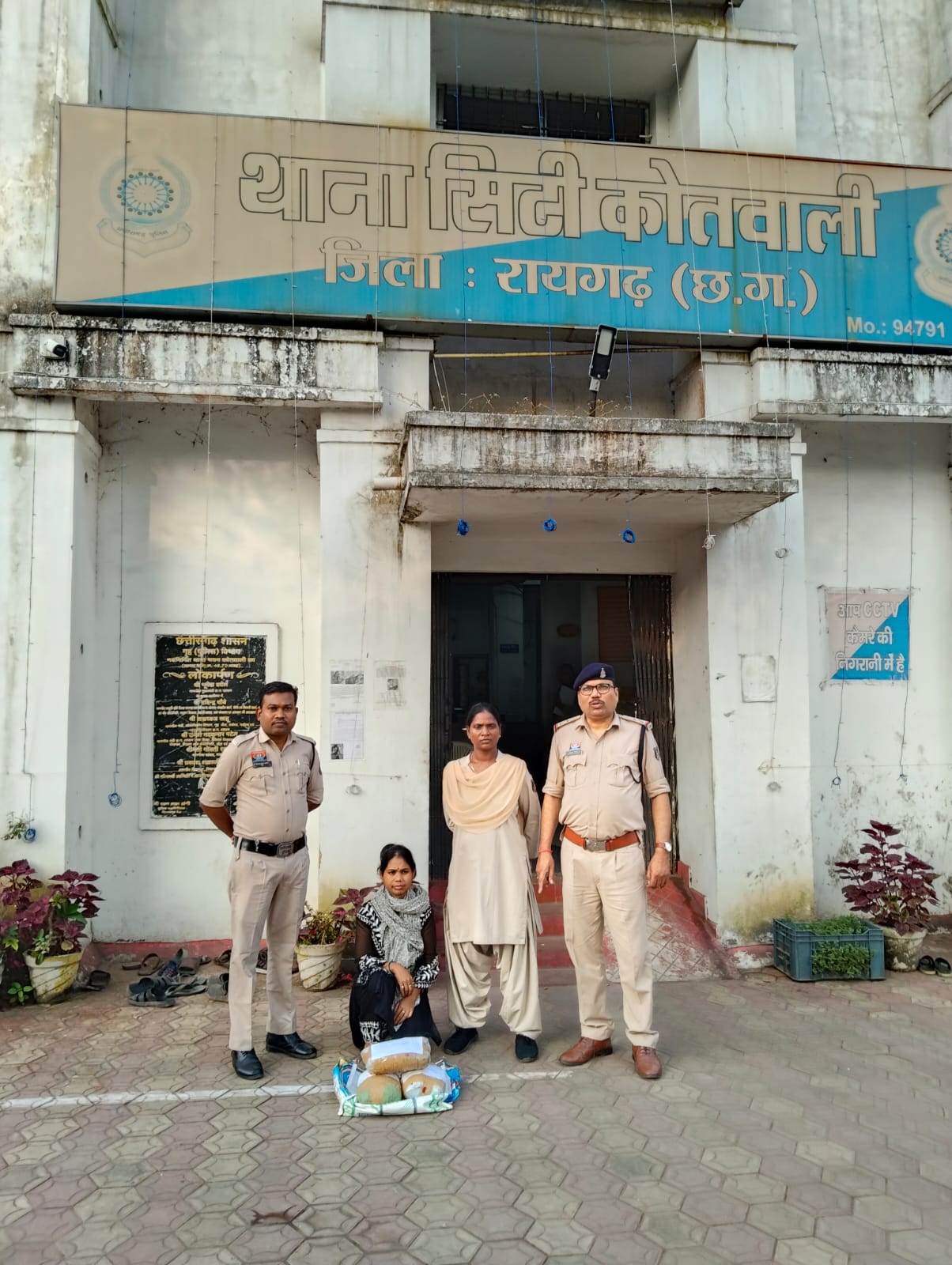 रायगढ़, । पुलिस अधीक्षक श्री दिव्यांग कुमार पटेल के दिशा-निर्देशन और नगर पुलिस अधीक्षक श्री मयंक मिश्रा के मार्गदर्शन में थाना कोतवाली पुलिस ने शहर के लक्ष्मीपुर क्षेत्र में अवैध मादक पदार्थ की बिक्री पर बड़ी कार्रवाई करते हुए एक महिला आरोपी को गिरफ्तार किया है। पुलिस ने आरोपी के पास से 3 किलोग्राम गांजा (कीमत ₹36,000) तथा एक मोबाइल फोन बरामद किया है।
