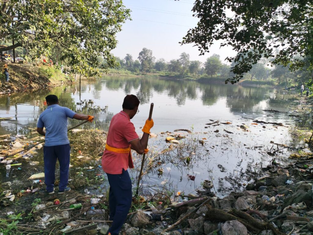 रायगढ़। रजत जयंती विशेष स्वच्छता पखवाड़ा 2025 के तहत मंगलवार को वार्ड क्रमांक 47 स्थित विजयपुर तालाब में सफाई अभियान चलाया गया। वार्डवासियों महापौर श्री जीवर्धन चौहान कमिश्नर श्री बृजेश सिंह क्षत्रिय , एम आई सी सदस्यगण, स्वच्छता कर्मियों और नगर निगम टीम की संयुक्त पहल से तालाब परिसर में जमा प्लास्टिक, कचरा व जलकुंभी को हटाते हुए सफाई की गई।