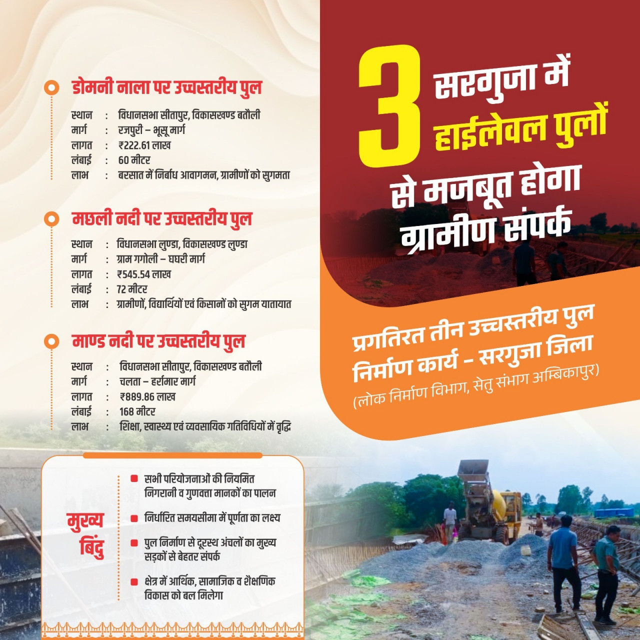 लोक निर्माण विभाग द्वारा सभी कार्यों की नियमित रूप से निगरानी की जा रही है तथा गुणवत्ता मानकों का विशेष ध्यान रखते हुए निर्माण कार्य निर्धारित समयावधि में पूर्ण कराए जाने का लक्ष्य रखा गया है। इन पुलों के निर्माण से सरगुजा जिले के दूरस्थ अंचलों के ग्रामीण क्षेत्रों को मुख्य सड़कों से जोड़ने में सहायता मिलेगी, जिससे आवागमन, शिक्षा, स्वास्थ्य एवं आर्थिक गतिविधियों में व्यापक सुधार होगा।