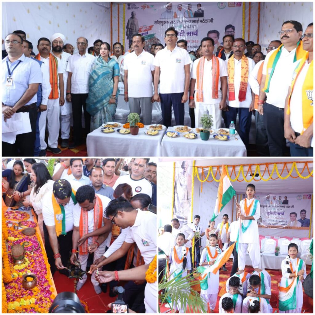 रायगढ़, राष्ट्रीय एकता के शिल्पकार एवं भारत रत्न सरदार वल्लभभाई पटेल की 150वीं जयंती के अवसर पर रायगढ़ जिले में आज बुधवार को ‘यूनिटी मार्च’ का भव्य शुभारंभ हुआ। यह आयोजन के माध्यम में सरदार पटेल जी के योगदान, उनके दृढ़ नेतृत्व और ‘एक भारत-श्रेष्ठ भारत’ राष्ट्रीय एकता एवं विकसित भारत के संदेश को जन-जन तक पहुँचाने का एक सार्थक प्रयास किया जा रहा है। इसके तहत आज विकासखण्ड मुख्यालय घरघोड़ा में आयोजित कार्यक्रम में प्रदेश के वित्त मंत्री श्री ओ.पी.चौधरी, लोकसभा सांसद श्री राधेश्याम राठिया और राज्यसभा सांसद श्री देवेन्द्र प्रताप सिंह और जनप्रतिनिधियों ने तमनार तक 12 किलोमीटर पदयात्रा का भारत माता, छत्तीसगढ़ महतारी, सरदार वल्लभ भाई पटेल और महात्मा गांधी के छायाचित्र पर माल्यार्पण एवं विधिवत पूजा-अर्चना कर शुभारंभ किया। इस अवसर पर स्कूली बच्चों द्वारा सांस्कृतिक कार्यक्रम, देशभक्ति गीत में नृत्य, बारडोली सत्याग्रह, ‘सरदार’ उपाधि की पृष्ठभूमि, 565 रियासतों का विलय और सरदार पटेल के प्रेरक प्रसंग को नुक्कड़ नाटक के माध्यम से रोचक ढंग से प्रस्तुत किया।