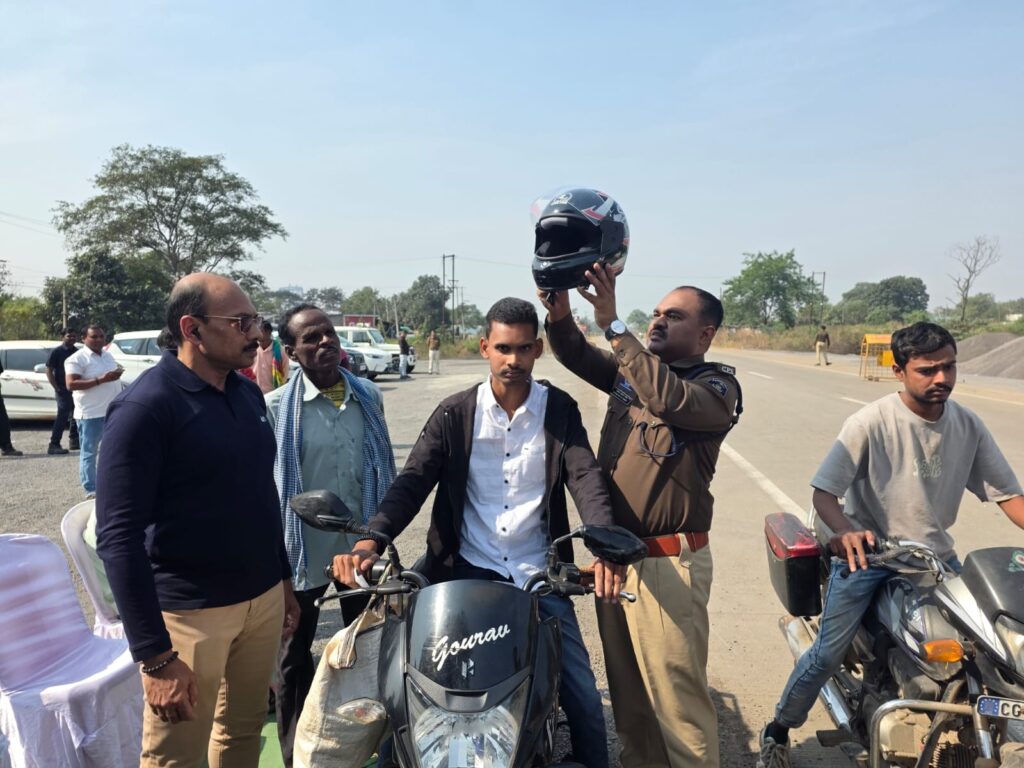 *रायगढ़, । पुलिस अधीक्षक श्री दिव्यांग पटेल के दिशा-निर्देशन पर आमजन को यातायात नियमों के प्रति जागरूक करने और सुरक्षित व सुगम यातायात व्यवस्था सुनिश्चित करने जिले में पुलिस द्वारा लगातार मोटर व्हीकल जांच कार्यवाही और विविध जागरूकता कार्यक्रम चलाए जा रहे हैं। इसी क्रम में आज 29 नवंबर 2025 को हेलमेट उपयोग की अनिवार्यता पर जोर देने के उद्देश्य से यातायात पुलिस रायगढ़ और भूपदेवपुर पुलिस ने एनएच-49 स्थित चिन्हित ब्लैक स्पॉट कांशीचुंवा चौक पर जागरूकता कार्यक्रम आयोजित किया । यातायात और भूपदेवपुर पुलिस ने इस दौरान एनएच पर बिना हेलमेट दुपहिया चलाते मिले वाहन चालाकों का मोटर व्हीकल एक्ट के तहत चालानी कार्यवाही की और उन्हें नि:शुल्क हेलमेट प्रदाय कर हमेशा हेलमेट पहनने प्रेरित किया गया ।