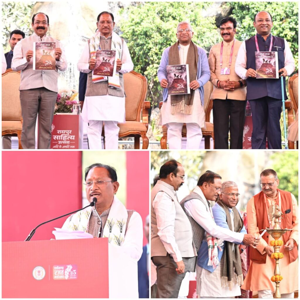 रायपुर /राजधानी रायपुर के नवा रायपुर स्थित पुरखौती मुक्तांगन परिसर में आज रायपुर साहित्य उत्सव 2026 का भव्य शुभारंभ हुआ। उद्घाटन समारोह राज्यसभा के उप सभापति श्री हरिवंश के मुख्य आतिथ्य और मुख्यमंत्री विष्णु श्री देव साय की अध्यक्षता में संपन्न हुआ। समारोह का आयोजन विनोद कुमार शुक्ल मंडप में किया गया, जिसमें उपमुख्यमंत्री अरुण साव, महात्मा गांधी अंतरराष्ट्रीय हिंदी विश्वविद्यालय वर्धा की कुलपति डॉ. कुमुद शर्मा तथा सुप्रसिद्ध रंगकर्मी एवं अभिनेता मनोज जोशी विशिष्ट अतिथि के रूप में उपस्थित थे। इस अवसर पर मुख्यमंत्री के मीडिया सलाहकार श्री पंकज झा, वरिष्ठ पत्रकार अनंत विजय तथा छत्तीसगढ़ साहित्य अकादमी के अध्यक्ष शशांक शर्मा सहित अनेक गणमान्य नागरिक उपस्थित थे।