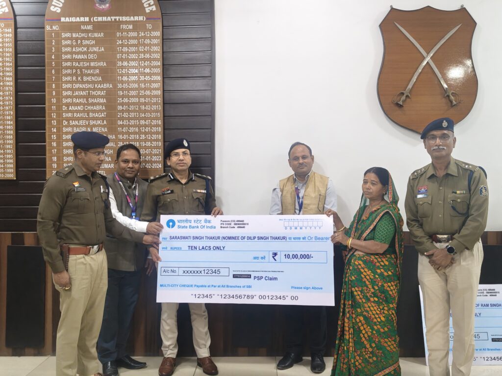 रायगढ़, । ड्यूटी के दौरान आकस्मिक निधन होने पर जिले में पदस्थ स्वर्गीय प्रधान आरक्षक दिलीप ठाकुर की पत्नी श्रीमती सरस्वती सिंह ठाकुर एवं जीआरपी थाने में पदस्थ स्वर्गीय राम सिंह लकड़ा की पत्नी श्रीमती किरण लकड़ा को पुलिस सैलरी पैकेज के अंतर्गत 10–10 लाख रुपये की बीमा राशि का चेक प्रदान किया गया। यह सहायता राशि वरिष्ठ पुलिस अधीक्षक शशि मोहन सिंह एवं एसबीआई शाखा पुसौर के प्रबंधक द्वारा सौंपते हुए शोकसंतप्त परिवारों के प्रति गहरी संवेदना व्यक्त की गई।