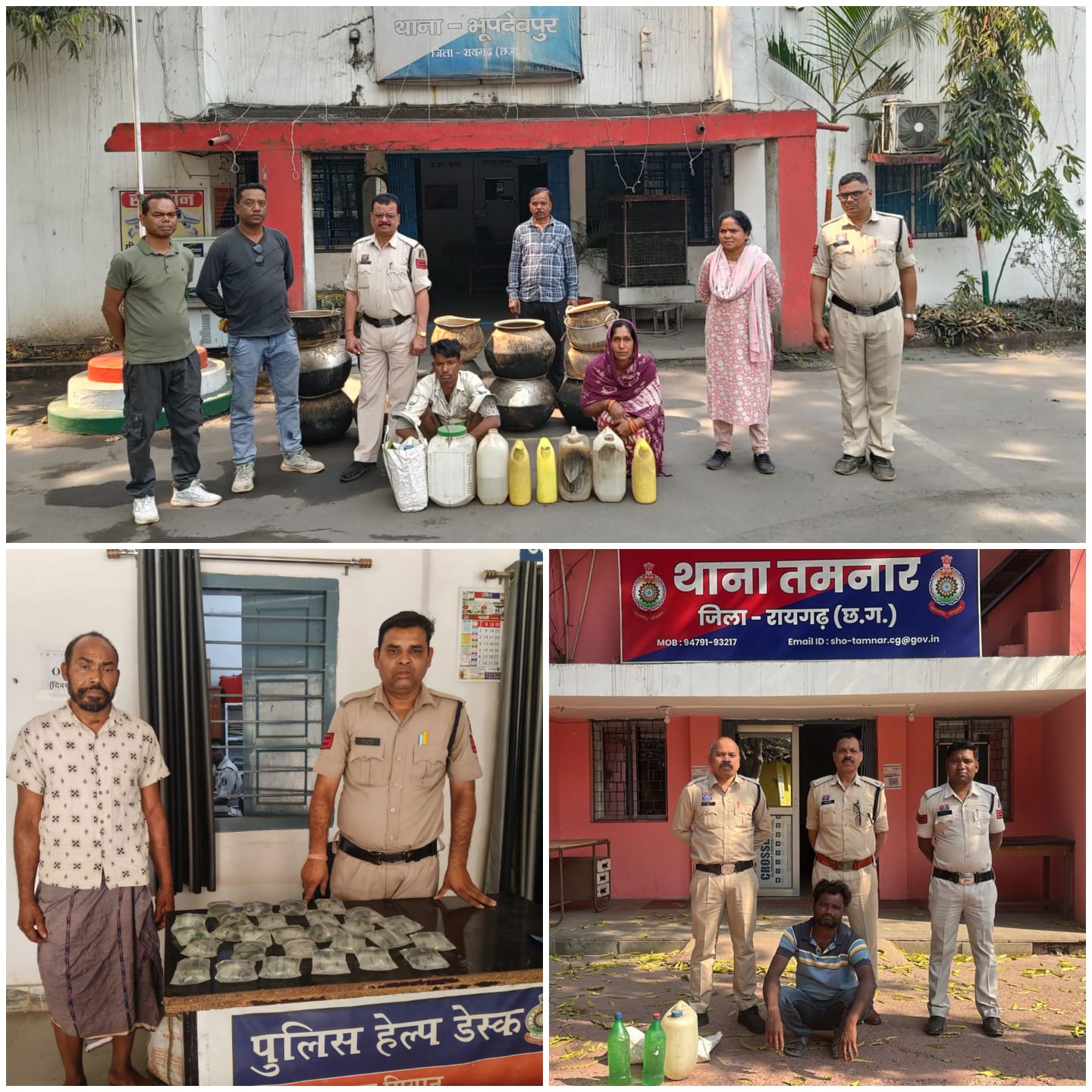 *15 मार्च, रायगढ़* । वरिष्ठ पुलिस अधीक्षक रायगढ़ श्री शशि मोहन सिंह के दिशा निर्देशन पर जिले में चलाए जा रहे “ऑपरेशन आघात” के तहत अवैध शराब के कारोबार पर लगातार ताबड़तोड़ कार्रवाई जारी है। इसी क्रम में दिनांक 14.03.2026 को थाना भूपदेवपुर, पुसौर और तमनार पुलिस द्वारा अलग-अलग स्थानों पर कार्रवाई करते हुए अवैध बिक्री के लिए रखी गई महुआ शराब जब्त कर आरोपियों को गिरफ्तार कर न्यायिक रिमांड पर भेजा गया है।