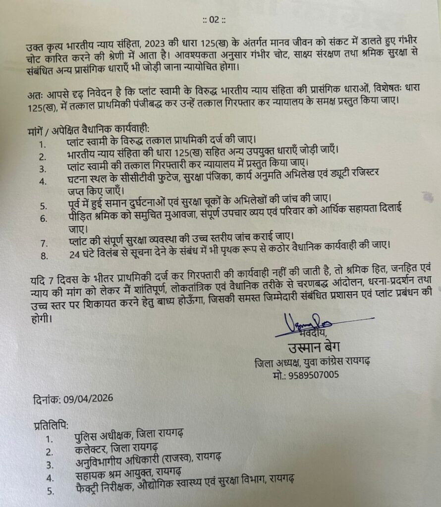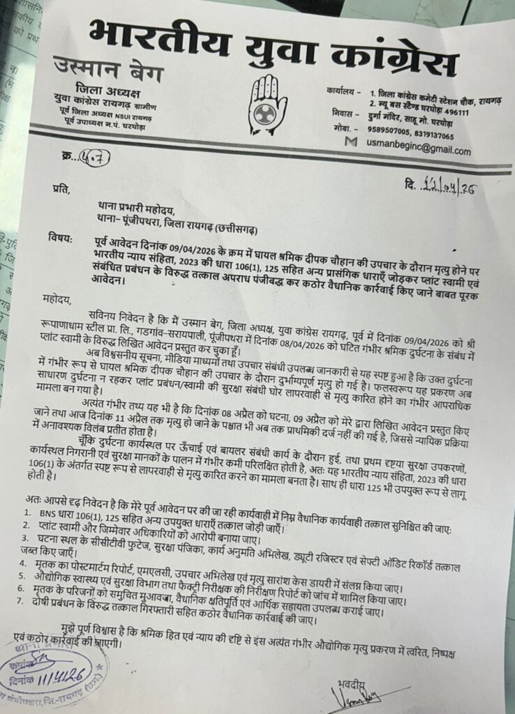 प्रदेश महासचिव राकेश पांडे के निर्देश पर घटना के अगले ही दिन 09 अप्रैल 2026 को युवा कांग्रेस रायगढ़ के जिला अध्यक्ष उस्मान बेग ने थाना पूंजीपथरा पहुंचकर पहला लिखित आवेदन दिया था, जिसमें प्लांट स्वामी एवं संबंधित प्रबंधन के विरुद्ध वैधानिक कार्रवाई तथा प्राथमिकी दर्ज करने की मांग की गई थी। आवेदन में प्लांट प्रबंधन पर श्रमिक सुरक्षा मानकों की अनदेखी, सुरक्षा उपकरणों की कमी तथा जिम्मेदार अधिकारियों की लापरवाही का मुद्दा प्रमुखता से उठाया गया था।