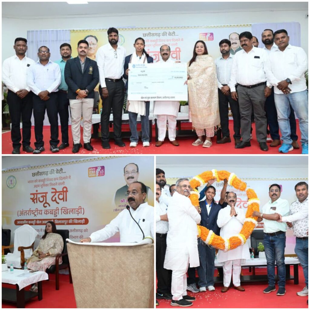 रायपुर. 18 अप्रैल 2026. भारत को कबड्डी विश्वकप और एशियन चैंपियनशिप दिलाने में अहम भूमिका निभाने वाली संजू देवी को राज्य शासन के खेल एवं युवा कल्याण विभाग द्वारा 50 लाख रुपए की प्रोत्साहन राशि प्रदान की गई है। छत्तीसगढ़ में पहली बार किसी खिलाड़ी को इतनी बड़ी प्रोत्साहन राशि दी गई है। उप मुख्यमंत्री तथा खेल एवं युवा कल्याण मंत्री श्री अरुण साव ने आज नवा रायपुर स्थित अपने निवास कार्यालय में आयोजित सम्मान समारोह में उन्हें यह राशि सौंपी। श्री साव ने इस दौरान बिलासपुर के चिंगराजपारा कबड्डी क्लब को कबड्डी मैट भी प्रदान किया।