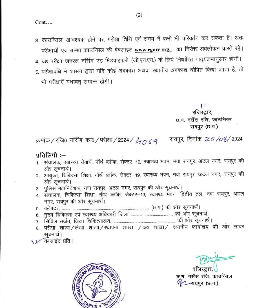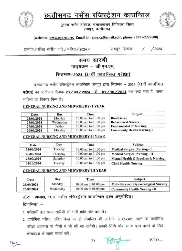 छत्तीसगढ़ नर्सेज रजिस्ट्रेशन काउंसिल (cgnrc) द्वारा 41 वी (GNM) जनरल नर्सिंग एंड मिडवाइफरी की परीक्षा की तिथि घोषित ।