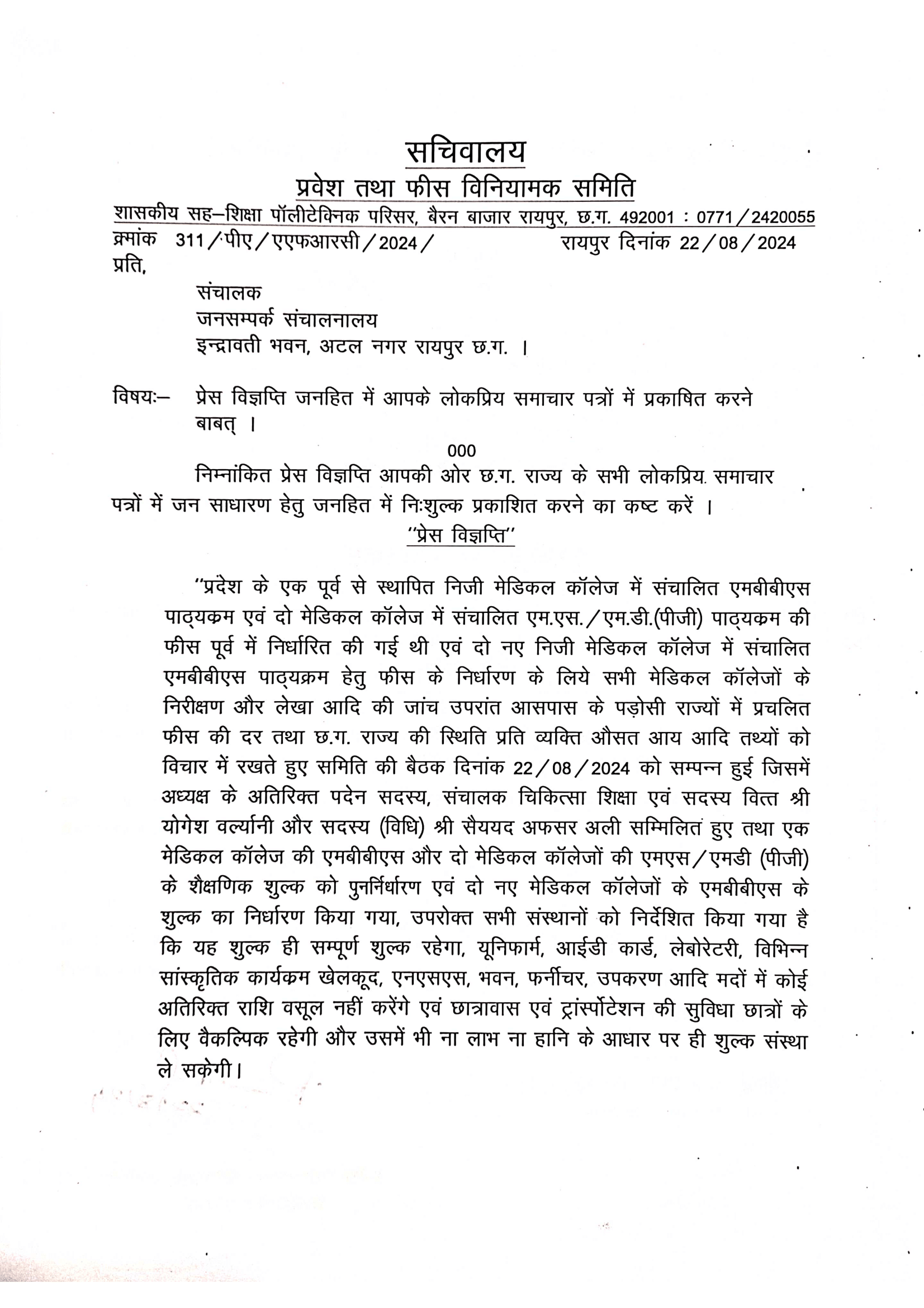 विनियामक समिति ने निजी मेडिकल कालेजों के निरीक्षण, जांच, पड़ोसी राज्यों में प्रचलित फीस की दर और छत्तीसगढ़ की स्थिति प्रति व्यक्ति औसत आय आदि तथ्यों को देखते हुए बैठक कर फीस तय की गई है।