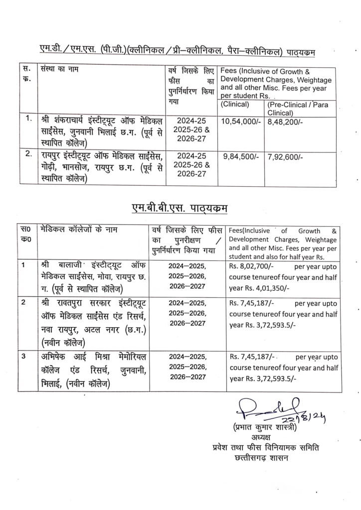 1) रायपुर इंस्टीट्यूट ऑफ मेडिकल साइंस (RIMS) गोढ़ी में PG की क्लीनिकल सीटों के लिए 9,84,500 रूपए प्रति वर्ष छात्रों को फीस देने होंगे। वहीं Pre Clinical / Para Clinical के लिए प्रति वर्ष 7,92,000 लाख रुपये से 8,48,000 रुपए तक फीस तय हुई है।