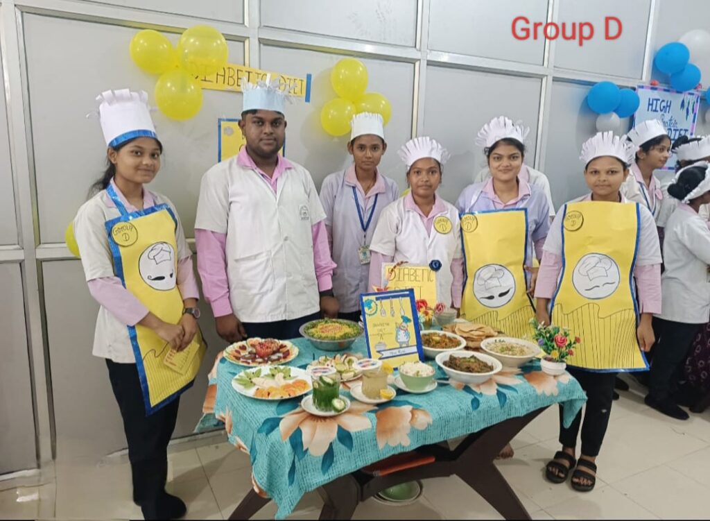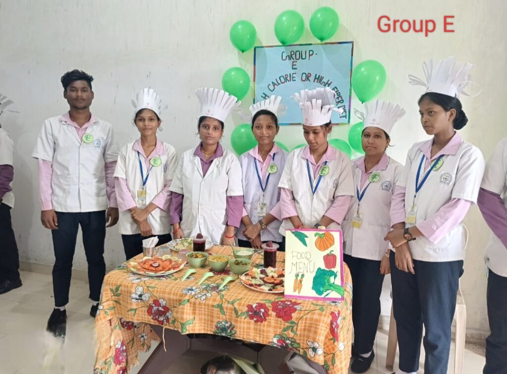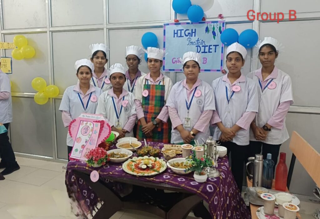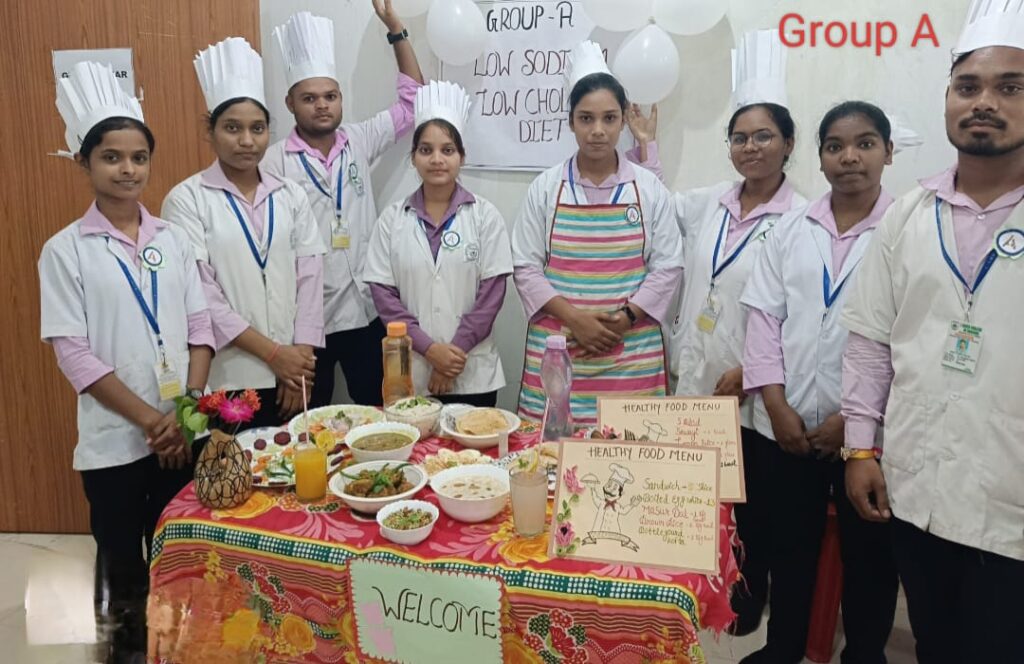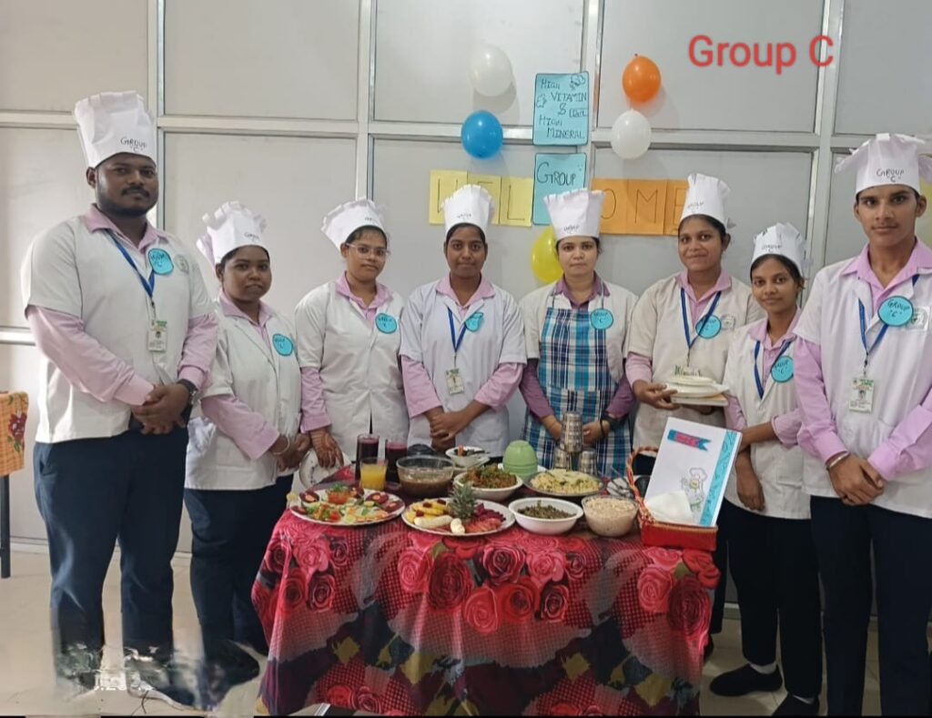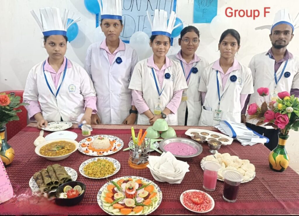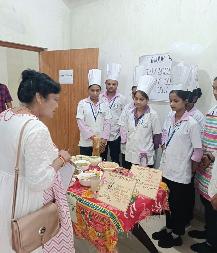 INC के सिलेबस को 100% फॉलो करते हुए BSc 2nd सेमेस्टर एवं GNM 1st year के छात्र एवं छात्राओं का Nutrition Pratical लिया गया l इसमें सभी विद्यार्थियों को 6 ग्रुप में बांटा गया था (A,B,C,D,E,F) और सभी समूह को अलग-अलग मरीज की बीमारी के हिसाब से खान सामग्री बनाना था । मरीज के लिए बनाए गए व्यंजन में यह दर्शाते हैं कि किस मरीज को सा और कितना कैलोरी फूड देना आवश्यक है । सभी विद्यार्थी न्यूट्रिशन प्रेक्टिकल करते हुए काफी उत्साहित थे और कुछ नया सीखने के लिए तैयार थे । इन सब के आधार पर BSc नर्सिंग के उप्राचार्य श्री ईश्वर प्रसाद सर एवं GNM की प्राचार्य श्रीमती कदम त्रिपाठी जी ने बच्चों का न्यूट्रिशन प्रैक्टिकल का निरीक्षण किया , उनके द्वारा बनाए गए खाद्य पदार्थ में कितनी कैलोरिक वैल्यू है एवं किस पेशेंट को उनके द्वारा बनाया गया खाद पदार्थ दिया जा सकता है की जानकारी प्राप्त की और उन्हें इतना अच्छा खाना ,प्रेजेंटेशन के लिए शाबाशी दी l