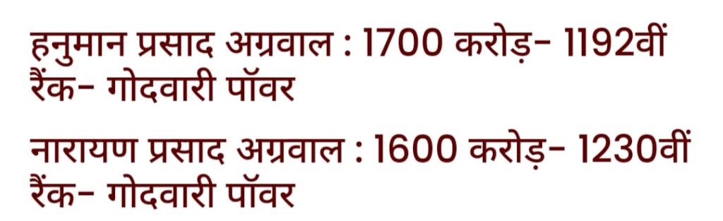 छठी और सातवें नंबर पर हैं नारायण प्रसाद अग्रवाल जी और हनुमान प्रसाद अग्रवाल जी जिनकी कंपनी गोदावरी पावर पावर सेक्टर में काम करती है ।