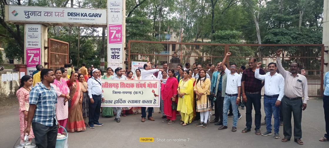 रायगढ़ :-छत्तीसगढ़ शिक्षक संघर्ष मोर्चा के प्रांतीय आव्हान पर रायगढ़ जिले के हजारों शिक्षकों ने सामूहिक अवकाश लेकर धरना प्रदर्शन कर रैली निकालकर मुख्यमंत्री के नाम कलेक्टर को ज्ञापन सौपा। जिला संचालक भोजराम पटेल, नेतराम साहू चूड़ामणि प्रकाश डनसेना ने बताया कि रायगढ़ जिले के एल.बी.संवर्ग के शिक्षक अपनी पांच सूत्रीय मांग जिसमें मोदी जी की गारंटी के तहत सहायक शिक्षकों की वेतन विसंगति दूर कर समस्त एल.बी. संवर्ग को क्रमोन्नति वेतनमान प्रदान करने समतुल्य वेतनमान (पुनरीक्षित वेतनमान) मे सही वेतन का निर्धारण कर 1.86 के गुणांक पर वेतन निर्धारण कर प्रदान करने ,पूर्व सेवा अवधि की गणना करते हुए समस्त शिक्षक एल.बी. संवर्ग के पुरानी पेंशन को निर्धारित करने एवं भारत सरकार द्वारा 2 सितंबर 2008 को जारी आदेश के तहत समान 33 वर्ष में पूर्ण पेंशन के स्थान पर 20 वर्ष में पूर्ण पेंशन का प्रावधान किया जाने, माननीय उच्च न्यायालय बिलासपुर द्वारा याचिका क्रमांक डब्ल्यू ए/ 261 /2024 मे डबल बैच द्वारा पारित निर्णय दिनांक 28 /02/2024 के तहत सभी पात्र एल.बी. संवर्ग के शिक्षकों के लिए क्रमोन्नति समयमान का विभागीय आदेश जारी किया करने व शिक्षक व कर्मचारियों को केंद्र के बराबर 1 जुलाई 2024 से 3% महंगाई भत्ता देने तथा जुलाई 2019 से देय तिथि पर मंगाई भत्ते के एरिया राशि का समायोजन जी पी एफ/सी जी पी एफ खाता में जमा किये जाने की पांच सूत्रीय मांग शामिल है ।धरना प्रदर्शन में श्री गुरुदेव राठौर जी ,वीरेंद्र चौहान सच्चिदानंद पटेल ,सुनील पटेल श्रीमती भुवनेश्वरी मंथन ,श्रीमती संजू डनसेन ,श्रीमती सपना दुबे, श्रीमती रणजीत कौर घई,गायत्री ठाकुर,श्रीमती अंजू ठाकुर ,श्रीमती रजनी महिलांगे ,श्रीमती प्रेमा सिदार ,श्रीमती मंजू अवस्थी ,श्री बिनेश भगत, खगेश्वर पटेल सुनील पटेल, बी एस पोर्ते, गुरूचरण भगत,ताम्रध्वज चंन्द्रा, इंद्रजीत शर्मा भूपेश पण्डा ,संतोष पटेल ,भोजराम पटेल ,चूड़ामणि प्रकाश डनसेना,नेतराम साहू ने संबोधित किया। कार्यक्रम का संचालन नोहर सिंह सिदार द्वारा किया गया। धरना प्रदर्शन के पश्चात रैली निकाल कर प्रदेश के मुख्यमंत्री वित्त मंत्री एवं उच्च अधिकारियों के नाम ज्ञापन सोपा गया कलेक्ट्रेट में सभी एलबी संवर्ग के सभी शिक्षकों ने अपनी मांगों के समर्थन में जोरदार नारा लगाते हुए मुख्यमंत्री के नाम ज्ञापन सौंप कर अपने कार्यक्रम को विराम दिया ।