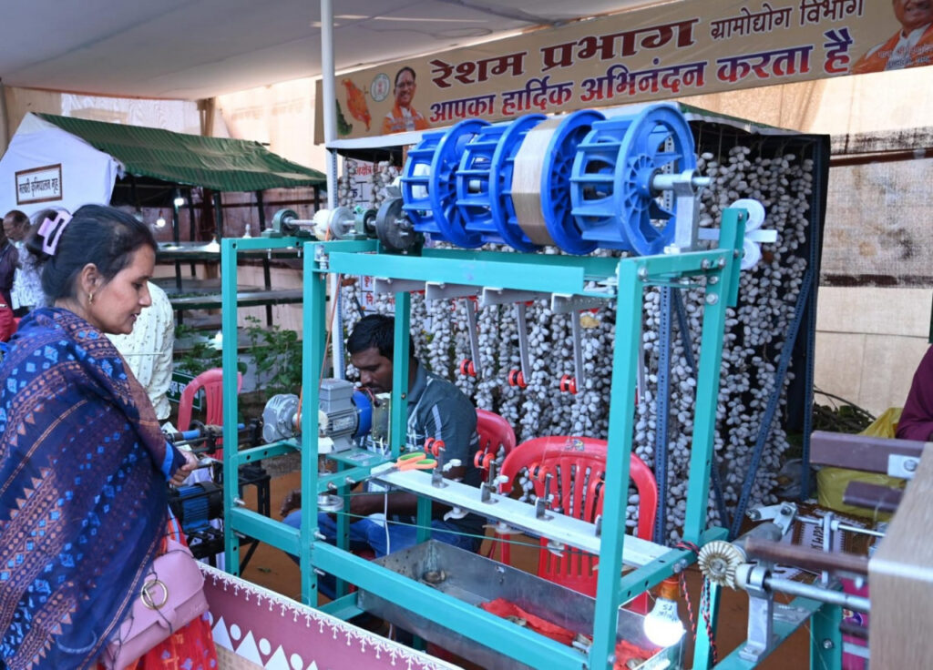 विभागीय स्टाल में आए किसानों और आमजनों ने ग्रामोद्योग विकास विभाग की योजनाओं के बारे में भी विस्तृत जानकारियां ली| गौरतलब है कि छत्तीसगढ़ कोसा उत्पादन एवं कोसा वस्त्र निर्माण के क्षेत्र में अग्रणी राज्य के रूप में प्रगति कर रहा है। मुख्यमंत्री श्री विष्णु देव साय के नेतृत्व में वन आधारित ग्रामोद्योग को बढ़ावा देने के संकल्प को पूरा करते हुए छत्तीसगढ़ टसर उत्पादन के क्षेत्र में परम्परागत रूप से विशिष्ट स्थान रखता है। रेशम प्रभाग के योजनाओं के जरिए ग्रामीण अंचल में निवासरत जरूरतमंद परिवारों को रोजगार, स्व-रोजगार उपलब्ध हो रहे हैं।