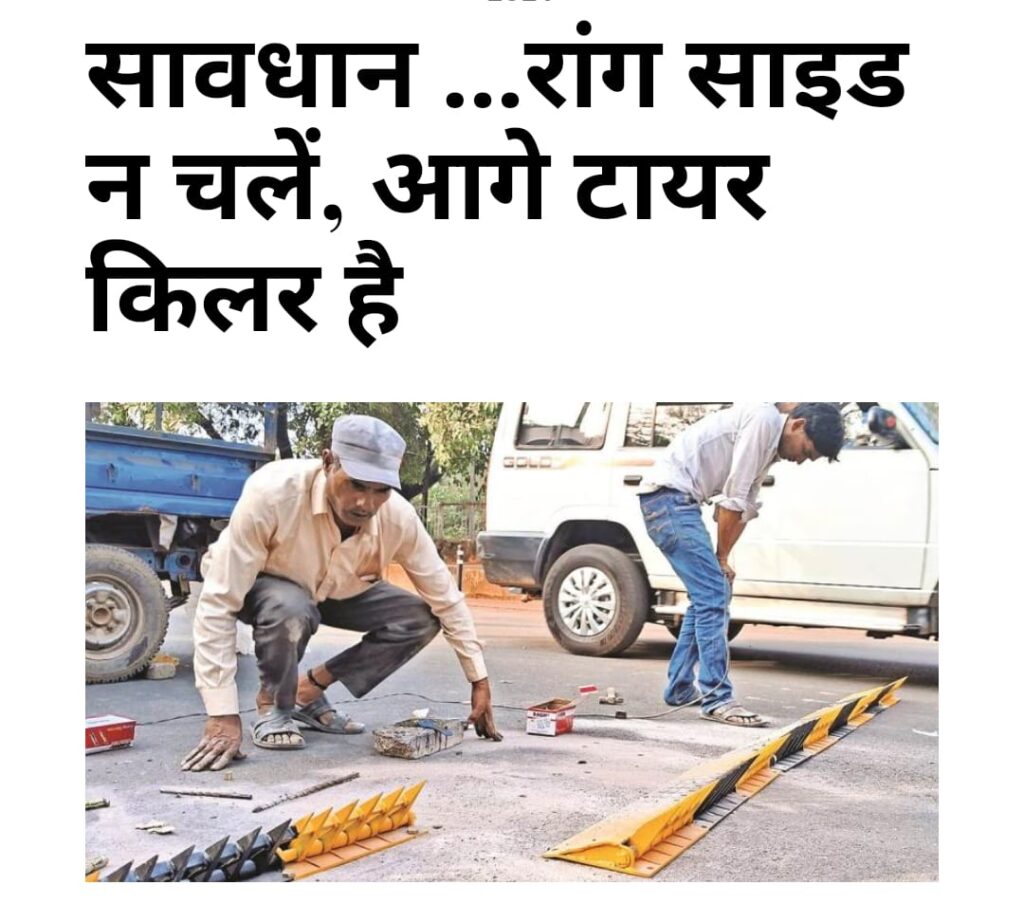 रायपुर राजधानी में अब रॉन्ग साइड में गए वाहनों के टायरों की अब खैर नहीं …नुकिलों लोहे के कांटों से होगा वह पंचर। दरअसल रायपुर में विपरीत दिशा से आने वाले वाहन चालकों को रोकने, यातायात व्यवस्था दुरुस्त करने तथा रांग साइड में वाहन चलाने से होने वाली सड़क दुर्घटनाओं को रोकने के उद्देश्य से टायर किलर लगाया जा रहा है। टायर किलर से पूर्व सूचना बोर्ड भी लगाया गया है कि रांग साइड न चलें, आगे टायर किलर है।