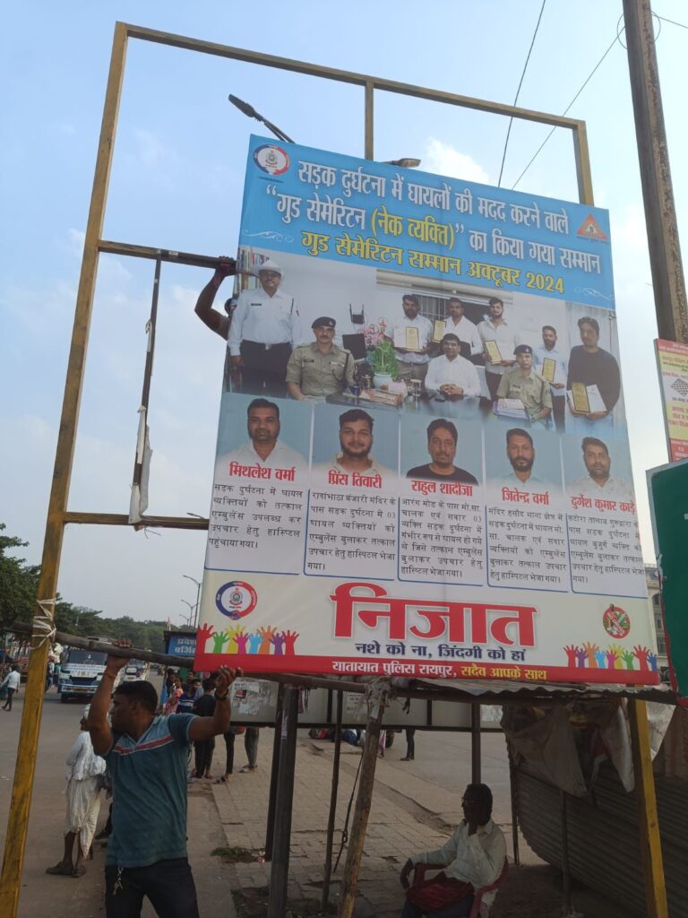 рд╡рд░рд┐рд╖реНрда рдкреБрд▓рд┐рд╕ рдЕрдзреАрдХреНрд╖рдХ рд░рд╛рдпрдкреБрд░ рдбреЙ. рд╕рдВрддреЛрд╖ рдХреБрдорд╛рд░ рд╕рд┐рдВрд╣ рджреНрд╡рд╛рд░рд╛ рдкреНрд░рддрд┐рдорд╛рд╣ рд╕реЬрдХ рджреБрд░реНрдШрдЯрдирд╛ рдореЗрдВ рдШрд╛рдпрд▓реЛрдВ рдХреА рдорджрдж рдХрд░ рдЙрдирдХреА рдЬрд╛рди рдмрдЪрд╛рдиреЗ рд╡рд╛рд▓реЗ рдЧреБрдб рд╕реЗрдореЗрд░рд┐рдЯрди (рдиреЗрдХ рд╡реНрдпрдХреНрддрд┐) рдХреЛ рдкреНрд░рд╢рд╕реНрддрд┐ рдкрддреНрд░ рдПрд╡рдВ рдкреНрд░рддрд┐рдХ рдЪрд┐рдиреНрд╣ рджреЗрдХрд░ рд╕рдореНрдорд╛рдирд┐рдд рдХрд┐рдпрд╛ рдЬрд╛рддрд╛ рд╣реИ рд╕рд╛рде рд╣реА рдЗрдирдХреЗ рдкреНрд░рдЪрд╛рд░-рдкреНрд░рд╕рд╛рд░ рдХреЗ рд▓рд┐рдП рд╢рд╣рд░ рдХреЗ рд░реЗрд▓рд╡реЗ рд╕реНрдЯреЗрд╢рди, рдмрд╕ рд╕реНрдЯреИрдгреНрдб, рдХрд▓реЗрдХреНрдЯреЛрд░реЗрдЯ рдЧреЗрдЯ рдПрд╡рдВ рдорд░реАрди рдбреНрд░рд╛рдЗрд╡ рдореЗрдВ рд╣реЛрд░реНрдбрд┐рдВрдЧреНрд╕ рд▓рдЧрд╛рдИ рдЬрд╛рддреА рд╣реИред рдЗрд╕реА рдХреНрд░рдо рдореЗрдВ рдорд╛рд╣ рдЕрдХреНрдЯреВрдмрд░ 2024 рдореЗрдВ рд╕реЬрдХ рджреБрд░реНрдШрдЯрдирд╛ рдореЗрдВ рдШрд╛рдпрд▓реЛрдВ рдХреА рдЬрд╛рди рдмрдЪрд╛рдиреЗ рд╡рд╛рд▓реЗ 05 рдЧреБрдб рд╕реЗрдореЗрд░рд┐рдЯрди (рдиреЗрдХ рд╡реНрдпрдХреНрддрд┐рдпреЛрдВ) рдХреЛ рдкреНрд░рд╢рд╕реНрддрд┐ рдкрддреНрд░ рдПрд╡рдВ рдкреНрд░рддрд┐рдХ рдЪрд┐рдиреНрд╣ рдкреНрд░рджрд╛рди рдХрд░ рд╕рдореНрдорд╛рдирд┐рдд рдХрд┐рдпрд╛ рдЧрдпрд╛ред