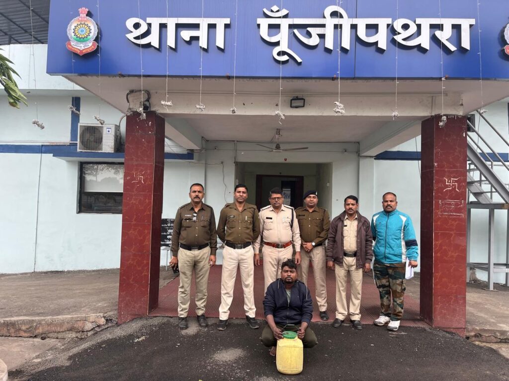 रायगढ़* । थाना प्रभारी पूंजीपथरा निरीक्षक राकेश मिश्रा के नेतृत्व में पूंजीपथरा पुलिस क्षेत्र में अवैध गतिविधियों पर नकेल कसने के लिए पुलिस नियमित गश्त और कार्रवाई कर रही है। कल थाना पूंजीपथरा पुलिस ने मुखबिर की सूचना पर कार्रवाई करते हुए एक सब्जी दुकान में चल रहे अवैध शराब बिक्री के कारोबार का भंडाफोड़ किया है। सहायक उप निरीक्षक जयराम सिदार, विजय एक्का और हमराह स्टाफ द्वारा यह शराब रेड कार्रवाई की गई। पुलिस टीम कल 29 नवंबर 2024 को ग्राम तराईमाल, गेरवानी, सराईपाली, जिवरी और देलारी क्षेत्र में पेट्रोलिंग पर थी। इस दौरान सूचना मिली कि ग्राम देलारी के राजा मैदान स्थित एक सब्जी दुकान में अवैध महुआ शराब की बिक्री हो रही है। सूचना की पुष्टि के बाद पुलिस टीम ने दुकान पर दबिश दी। दुकान संचालक, विनोद कुमार पटैल (34), निवासी लमकना, जिला कटनी, मध्य प्रदेश, हाल निवासी ग्राम देलारी, मौके पर मौजूद मिला। पूछताछ में उसने स्वीकार किया कि वह सब्जी दुकान की आड़ में शराब बेच रहा है। तलाशी के दौरान दुकान में छिपाकर रखी गई 15 लीटर क्षमता की प्लास्टिक जरीकेन में भरी कच्ची महुआ शराब बरामद हुई। जब्त शराब की अनुमानित कीमत 1500 रुपये है। आरोपी का यह कृत्य छत्तीसगढ़ आबकारी अधिनियम की धारा 34(2), 59(क) के तहत अपराध की श्रेणी में पाया गया। पुलिस ने आरोपी के खिलाफ मामला दर्ज कर लिया है और उसे न्यायिक कार्रवाई हेतु पेश किया जाएगा। शराब रेड टीम में प्रधान आरक्षक लोमेश राजपूत, विनीत तिर्की, नंद साय, आरक्षक अभिषेक द्विवेदी, ओम प्रकाश तिवारी, नरेन्द्र पैंकरा और प्रभावित पुष्पा तिर्की शामिल थी ।