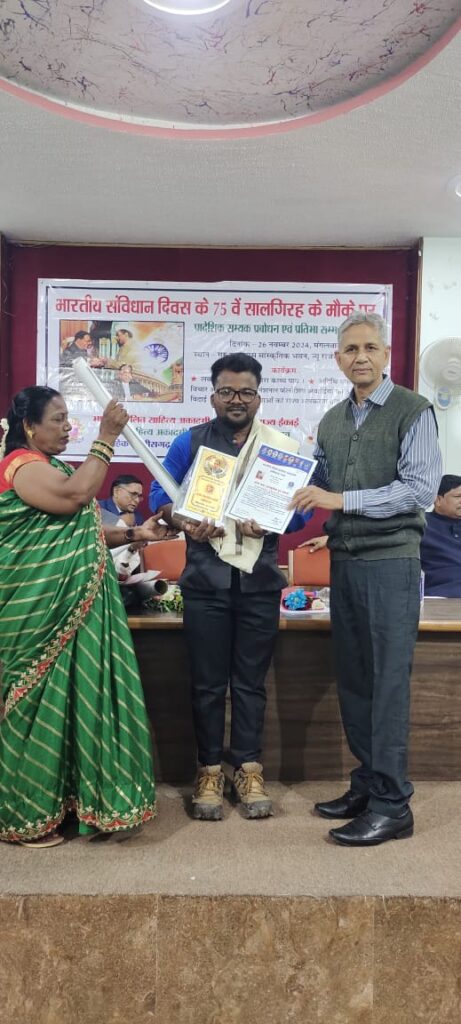 संस्था के प्रांताध्यक्ष जी आर बंजारे ने बताया कि प्रति वर्ष भा.द.सा.अ. द्वारा सामाजिक ,कला,खेल,साहित्य आदि क्षेत्रो में उत्कृष्ट कार्य करने वाले ब्यक्तियों को राज्य स्तर पर पर सम्मानित किया जाता है इस वर्ष पूरे राज्य से अलग अलग क्षेत्रो के लिये सम्मानित किया गया, जिसमे रायगढ़ के 3 होनहार लोक कलाकार संजू चौहान ,किस्मत चौहान और देवेंद्र चौहान को रायपुर में संविधान दिवस पर बिलासपुर उच्च न्यायालय के अवकाश प्राप्त न्यायाधीश एस एल मात्रे के करकमलों से साल श्रीफल स्मृति चिन्ह के साथ सांस्कृतिक दूत अवार्ड प्रदान किया गया ।