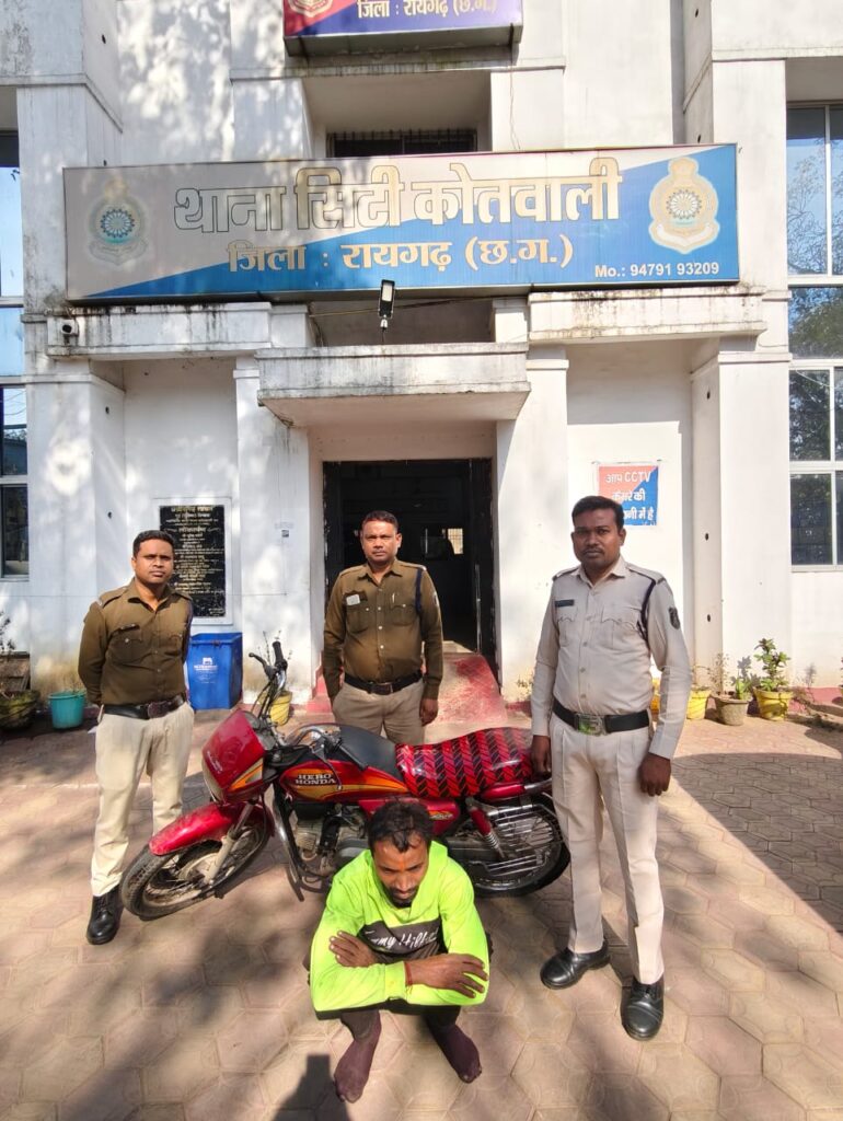 रायगढ़। कोतवाली पुलिस ने बाइक चोरी के एक मामले में त्वरित कार्रवाई करते हुए चोरी की गई मोटरसाइकिल बरामद कर ली है। पुलिस ने आरोपी सुशील देवांगन (39 वर्ष) सिदारपारा, थाना चक्रधरनगर को गिरफ्तार किया, जो बाइक को बेचने के लिए ग्राहक तलाश रहा था।