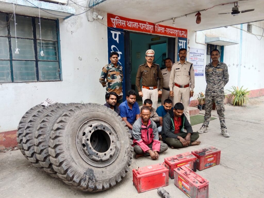 *21 दिसंबर, रायगढ़* । एसपी श्री दिव्यांग पटेल के दिशा निर्देशन पर अपराधों पर अंकुश लगाने की दिशा में संगठित होकर अपराध करने वालों पर पुलिस भारतीय न्याय संहिता की सुसंगत धाराओं पर कार्रवाई की जा रही है । इसी क्रम में घरघोड़ा पुलिस ने एक संगठित गिरोह का पर्दाफाश करते हुए ट्रांसपोर्ट ऑफिस से चोरी करने वाले चार आरोपियों और चोरी की संपत्ति खरीदने वाले दो लोगों सहित कुल छह लोगों को गिरफ्तार किया है। पुलिस ने आरोपियों के कब्जे से चोरी की संपत्ति—ट्रेलर टायर, बैटरी और अन्य उपकरण—कुल 93,000 रुपये की बरामद की है।