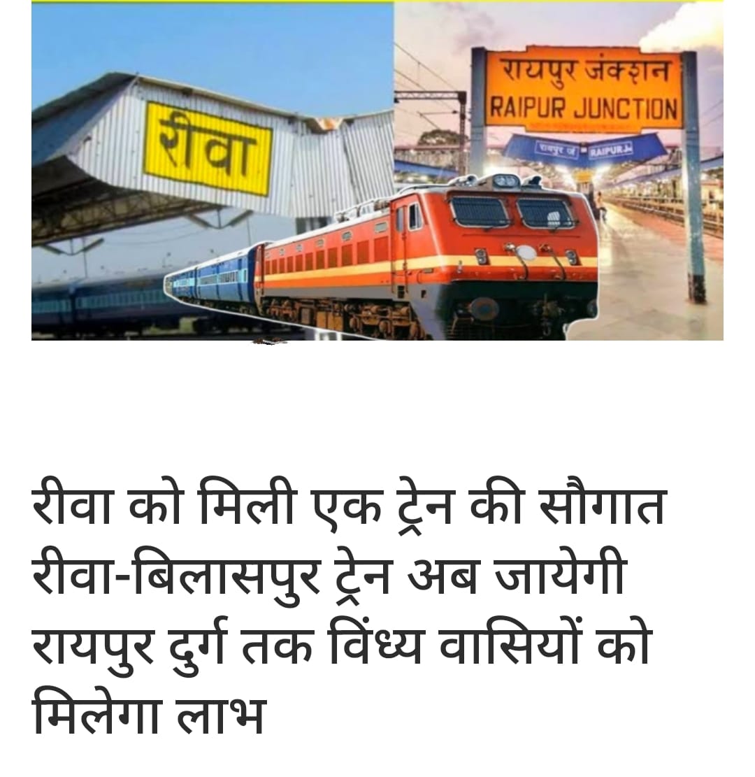 पिछले कुछ दिनों से गुड मॉर्निंग विध्य की राजधानी रीवा से छत्तीसगढ़ की राजधानी रायपुर तक सीधी ट्रेन अभियान चला रही है जिले के विभिन्न क्षेत्रों से जुड़े लोगों ने इस अभियान में अपना समर्थन जताया और रीवा से बिलासपुर होते हुए रायपुर या दुर्ग तक चलने वाली ट्रेनों के विस्तार की मांग की हम आपको बताते हैं।
